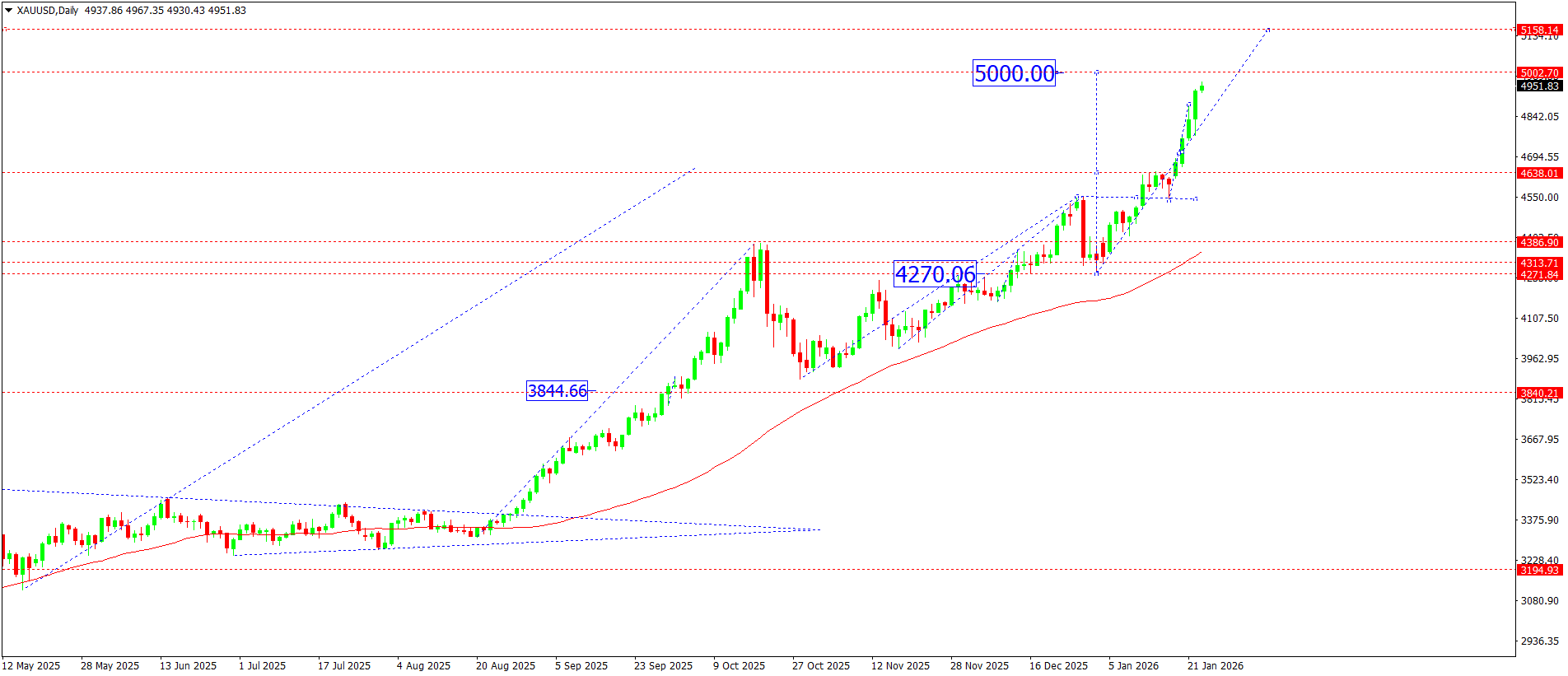 XAUUSD-тың күндік графигінде нарық бұрын ұсыныс аймағы ретінде әрекет еткен 4,888 деңгейінен жоғары сенімді бұзылды. Бұзылудан кейін баға жоғарыдан расталған қолдау алып, импульстік өсім толқынын жалғастырды. Ағымдағы құрылым 5,000 психологиялық деңгейіне қарай қозғалыстың жалғасуын меңзейді — бұл осы аптадағы негізгі мақсат ретінде тұр.
