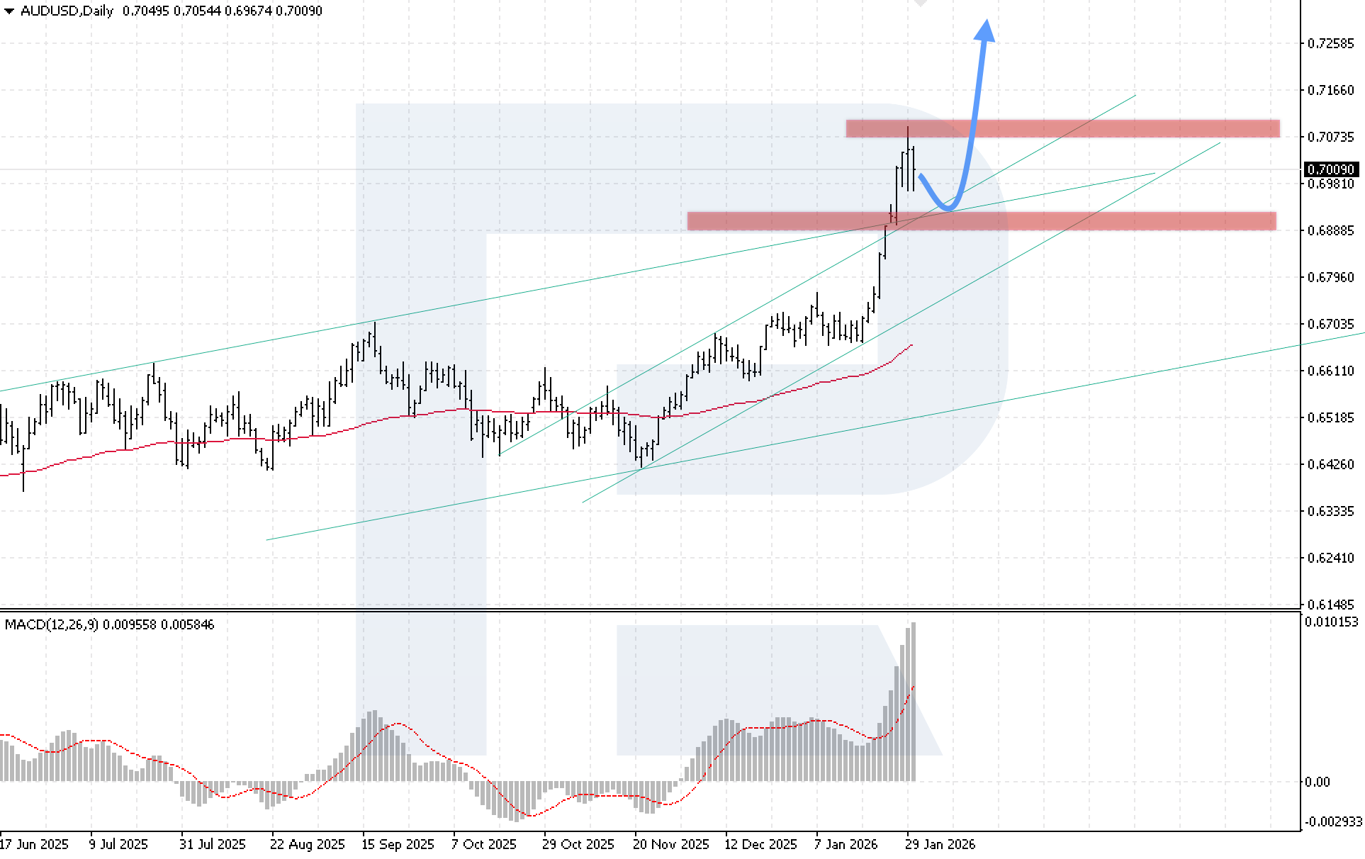 MACD талдауы бычий сценарийді растайды: гистограмма белсенді өсуде, ал бұқалар аюлы дивергенцияның қалыптасуын бейтараптандырды, бұл ағымдағы трендтің күшін көрсетеді. Осы аптада бычий сценарийдің іске асуы үшін 0.7105 деңгейінен жоғары бекітілу маңызды шарт болып табылады.