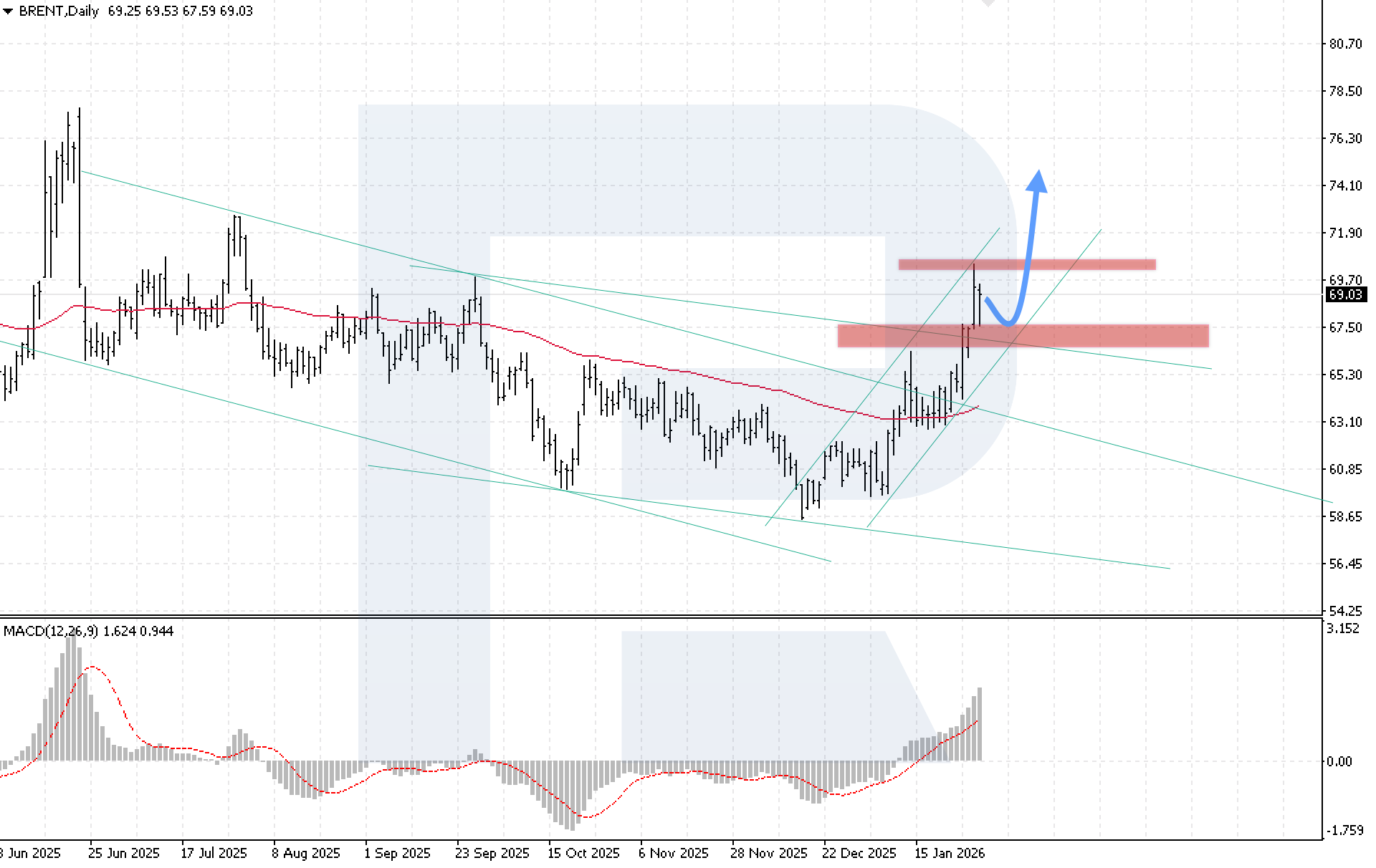 MACD индикаторы өсімнің сақталып отырғанын растайды: гистограмма қатарынан алты сессия бойы өсуде, бұл ағымдағы импульстің күшін және сатып алушылардың басымдығын көрсетеді. Осы аптада бычий сценарийдің іске асуы үшін 69.95 USD деңгейінен жоғары бекітілу маңызды шарт болып табылады.