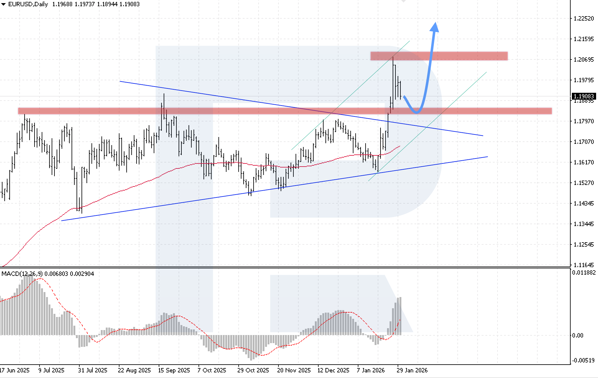 MACD талдауы бұл сценарийді растайды: гистограмма сенімді түрде өсіп келеді, тек жоғарғы бөлікте шамалы баяулау бар, бұл консолидация фазасын көрсетеді. Осы аптада бычий сценарийдің іске асуы үшін 1.1995 деңгейінен жоғары сенімді бекітілу маңызды шарт болып табылады.