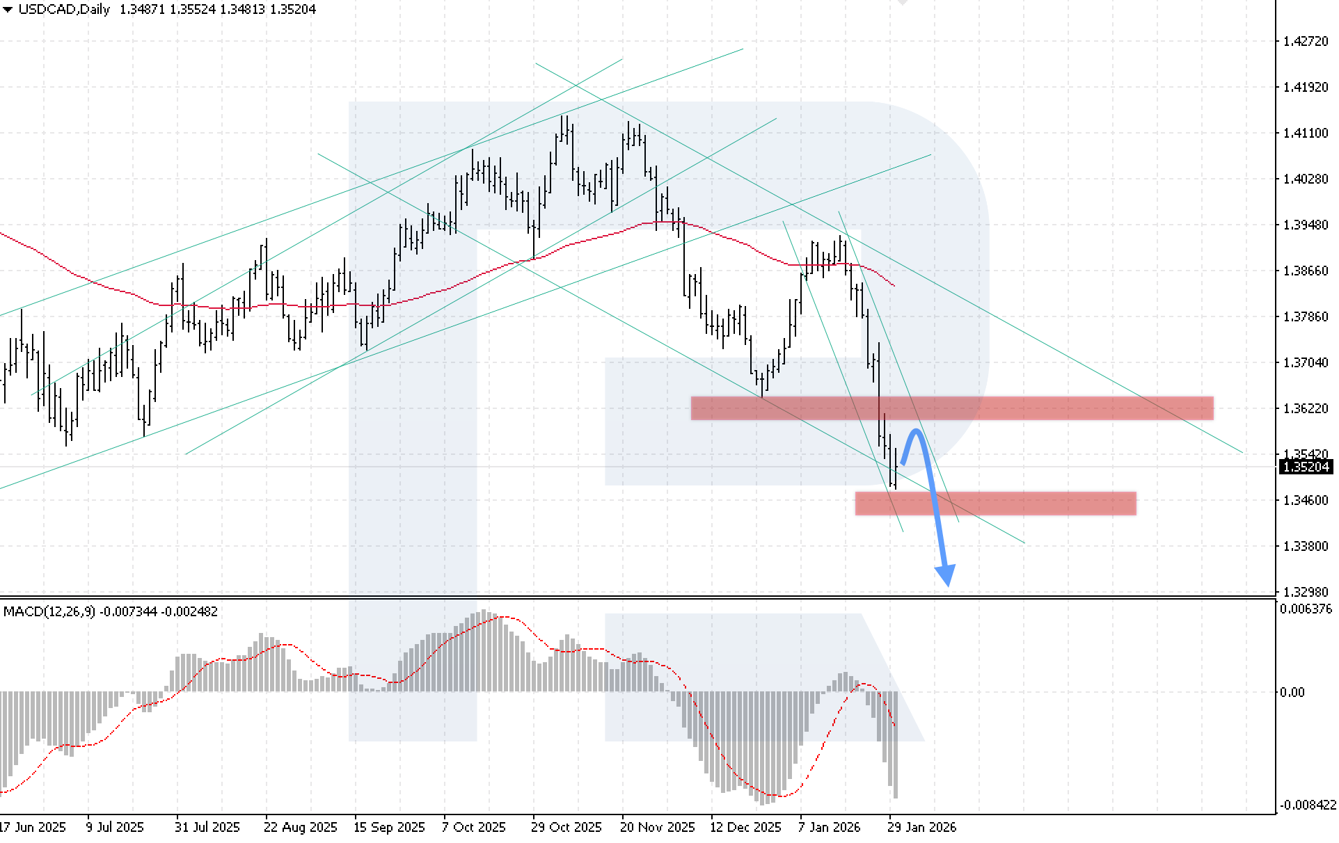MACD талдауы төмендеуші импульстің сақталып отырғанын растайды: гистограмма нөлдік сызықтан кейін агрессивті түрде төмендеуде, ал сатушылардың арнаның төменгі шекарасынан төмен бекіту әрекеттері аюлы қысымның күшейіп жатқанын көрсетеді. Осы аптада төмен сценарийдің іске асуы үшін 1.3455 деңгейінен төмен бекітілу маңызды шарт болып табылады.