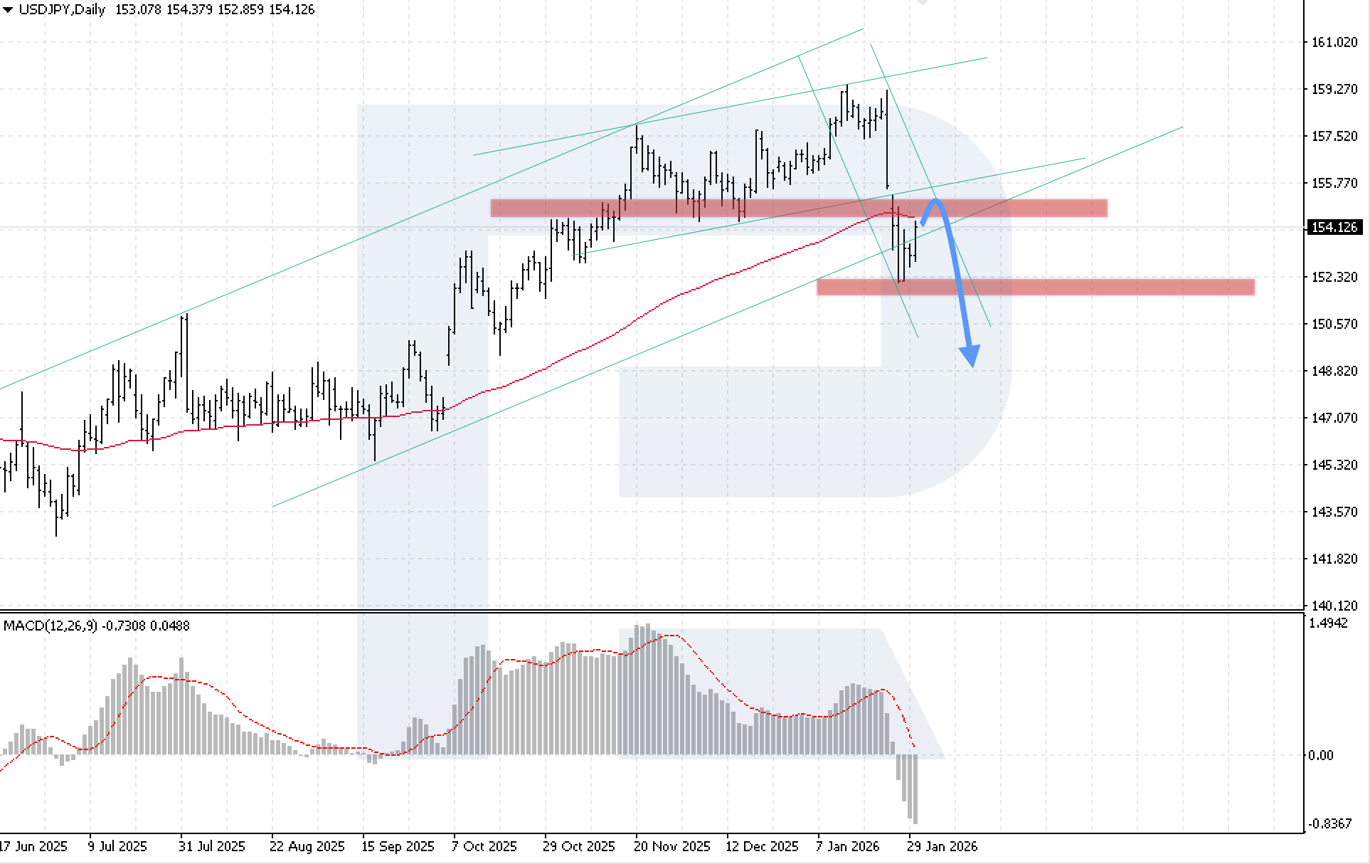 MACD талдауы аюлы сценарийді растайды: гистограмма нөлдік сызықтан төмен өткеннен кейін агрессивті түрде төмендеуде, бұл күшті аюлы импульсті көрсетеді. Осы аптада төмендеу сценарийінің іске асуы үшін 152.15 деңгейінен төмен бекітілу маңызды шарт болып табылады.