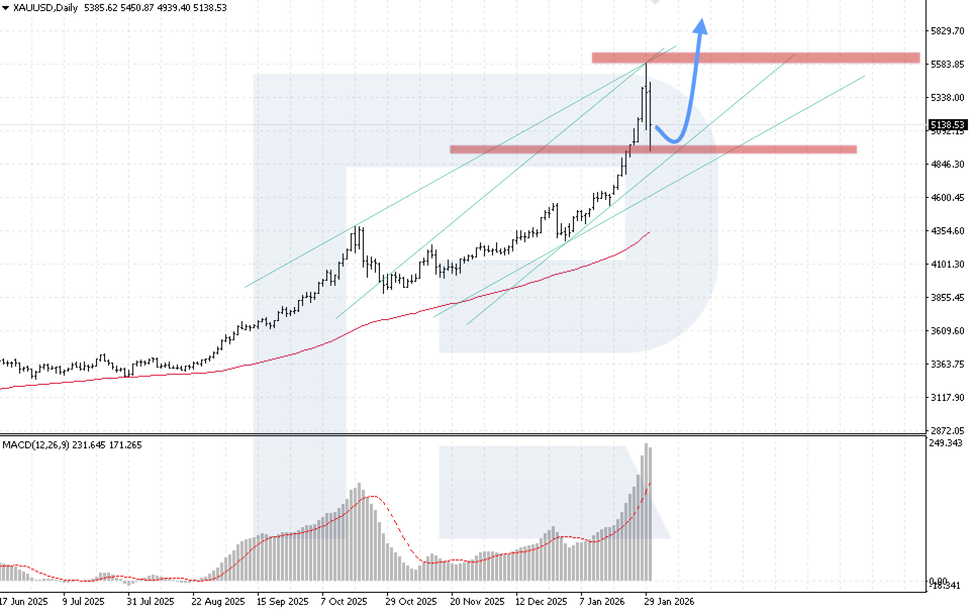 Альтернативті сценарий 4,845 USD қолдауы бұзылған жағдайда өзекті болады. Бұл ұзақ мерзімді бычий арнаның төменгі шекарасынан төмен шығуды және алтын нарығында терең әрі агрессивті коррекцияны білдіруі мүмкін.