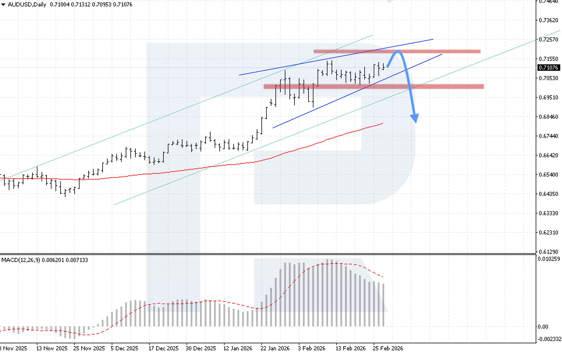 MACD импульстің баяулау кезеңін растайды: гистограмма жергілікті максимумға жеткеннен кейін төмендеуде, бұл жоғары импульстің әлсіреуін көрсетеді. Егер баға әрі қарай өссе, аюлы дивергенция қалыптасуы мүмкін, бұл аюлы түзету тәуекелін арттырады. Төмен бағыттағы сценарийдің негізгі шарты – 0.7035 деңгейінен төмен бекіну. Бұл Wedge үлгісінің төменгі шекарасынан төмен бұзылуды білдіріп, төменгі мақсаттарға қозғалысқа жол ашады.