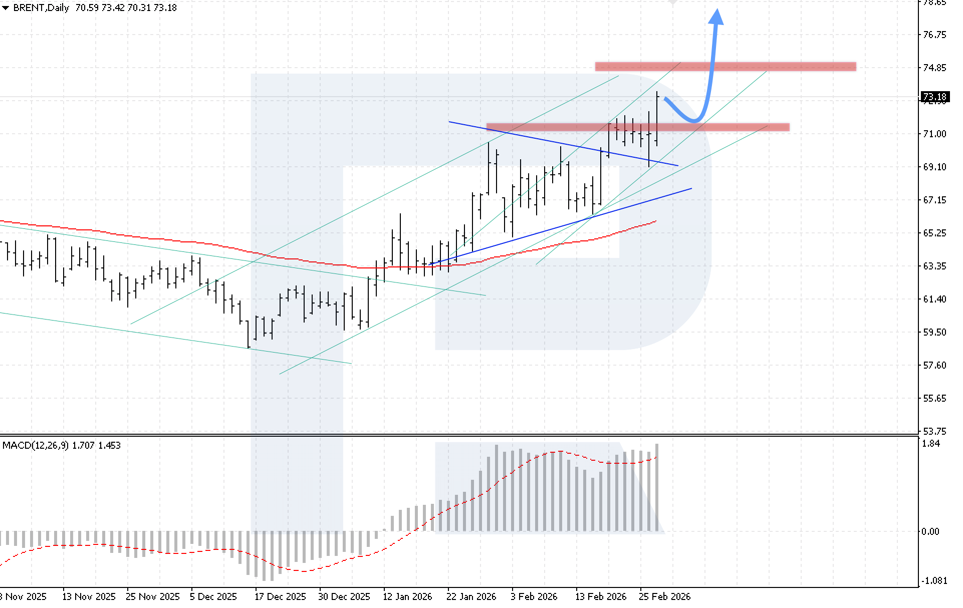 MACD өсуші тренд кезеңін растайды: гистограмма белсенді түрде өсуде, ал сатып алушылар аюлы дивергенцияны еңсерді, бұл бычий қысымды күшейтті. Дегенмен, жаңа аюлы дивергенцияның қалыптасу тәуекелі сақталуда. Осы аптадағы бычий сценарийдің негізгі шарты – 74.85 USD деңгейінен жоғары бекіну.