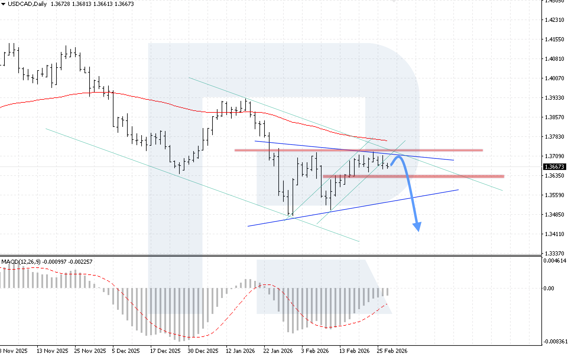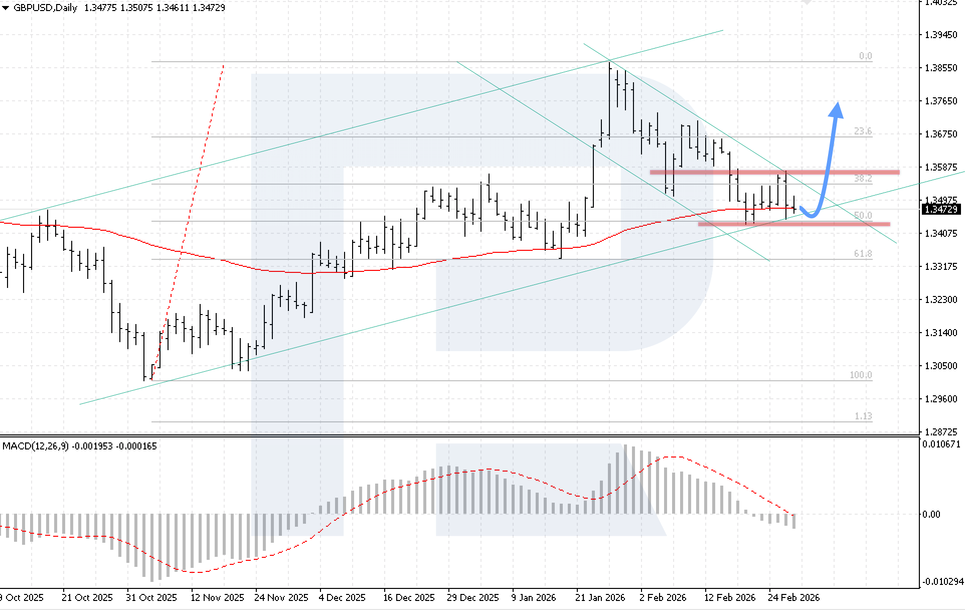 MACD түзету кезеңін көрсетеді: гистограмма баяулаудан кейін төмендеуде және нөлдік сызықтан төмен өтті, бұл бычий импульстің уақытша әлсіреуін білдіреді. Жоғары бағыттағы сценарийдің негізгі шарты – 1.3605 жергілікті қарсылық деңгейінен жоғары бекіну. Бұл Double Bottom кері бұрылу үлгісінің жоғарғы шекарасынан жоғары бұзылуды растап, төмендеуші арнадан шығумен түзетудің аяқталғанын білдіреді.