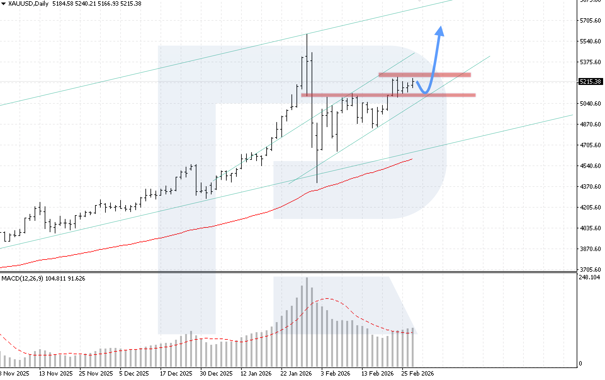 Күнделікті XAUUSD графигінде бычий қысым күшеюде. Сатып алушылар 5,220 USD жақын қарсылық деңгейін белсенді түрде сынауда, ал котировкалар өсуші арна ішінде қалуда. Апта басында 5,625 USD мақсатына қарай өсімнің жалғасуы ықтимал.