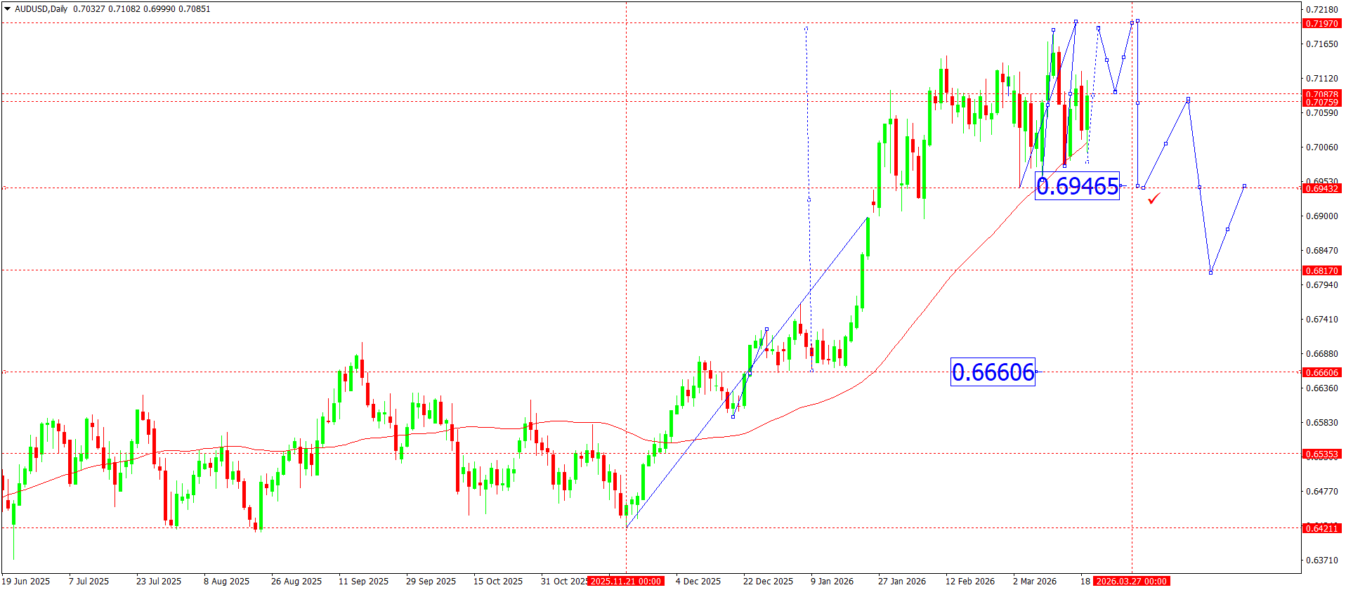 Күндік AUDUSD графигінде нарық бұған дейін 0.6419 аймағынан басталған тұрақты импульстік өсу құрылымын қалыптастырды. Осы импульс бағаны 0.7186 маңындағы негізгі қарсылық аймағына жеткізді, содан кейін түзету мен жергілікті консолидация фазасы басталды.