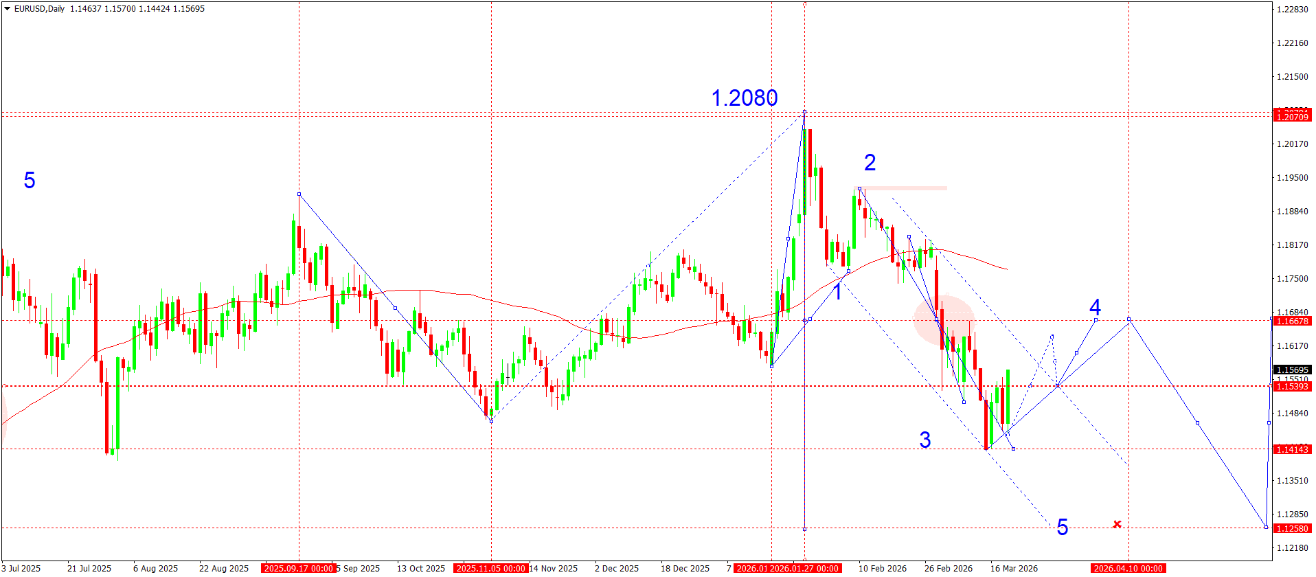 Күндік EURUSD графигінде 1.2080 маңында жергілікті максимум қалыптастырғаннан кейін нарық өсу фазасын аяқтап, төмендеуші импульстік құрылымға өтті. Осы максимумнан кейін төмен бағытталған толқын қалыптасып, қазір Elliott импульстік құрылымы ретінде дамып жатыр.