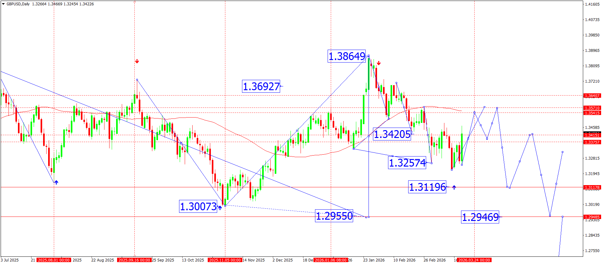 Күндік GBPUSD графигінде нарық 1.38649 маңындағы шыңмен аяқталған жоғары толқын құрылымын қалыптастырып болды. Осы деңгейге жеткеннен кейін төмендеу толқыны басталып, ол біртіндеп төмендеу импульсіне айналды.