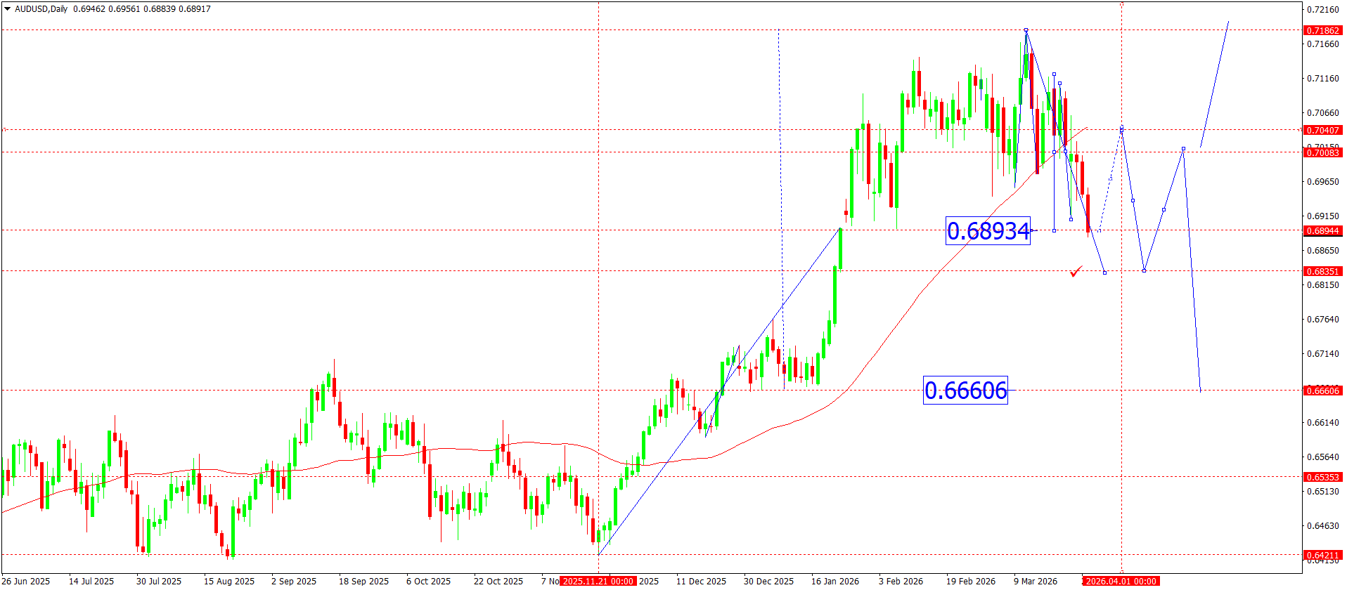 Толқындық құрылым тұрғысынан ағымдағы түзетуді өсу импульсі аяқталғаннан кейінгі кері тартылу толқыны ретінде қарастыруға болады. Осы контексте 0.6835 аймағы негізгі қолдау болып табылады, мұнда кері бұрылыс құрылымын қалыптастыру әрекеті болуы мүмкін. Осы аймақтан төмен бұзылу 0.6660 бағытына қарай тереңірек түзету әлеуетін ашады, мұнда анағұрлым маңызды қолдау мен жылжымалы орташа мән орналасқан.