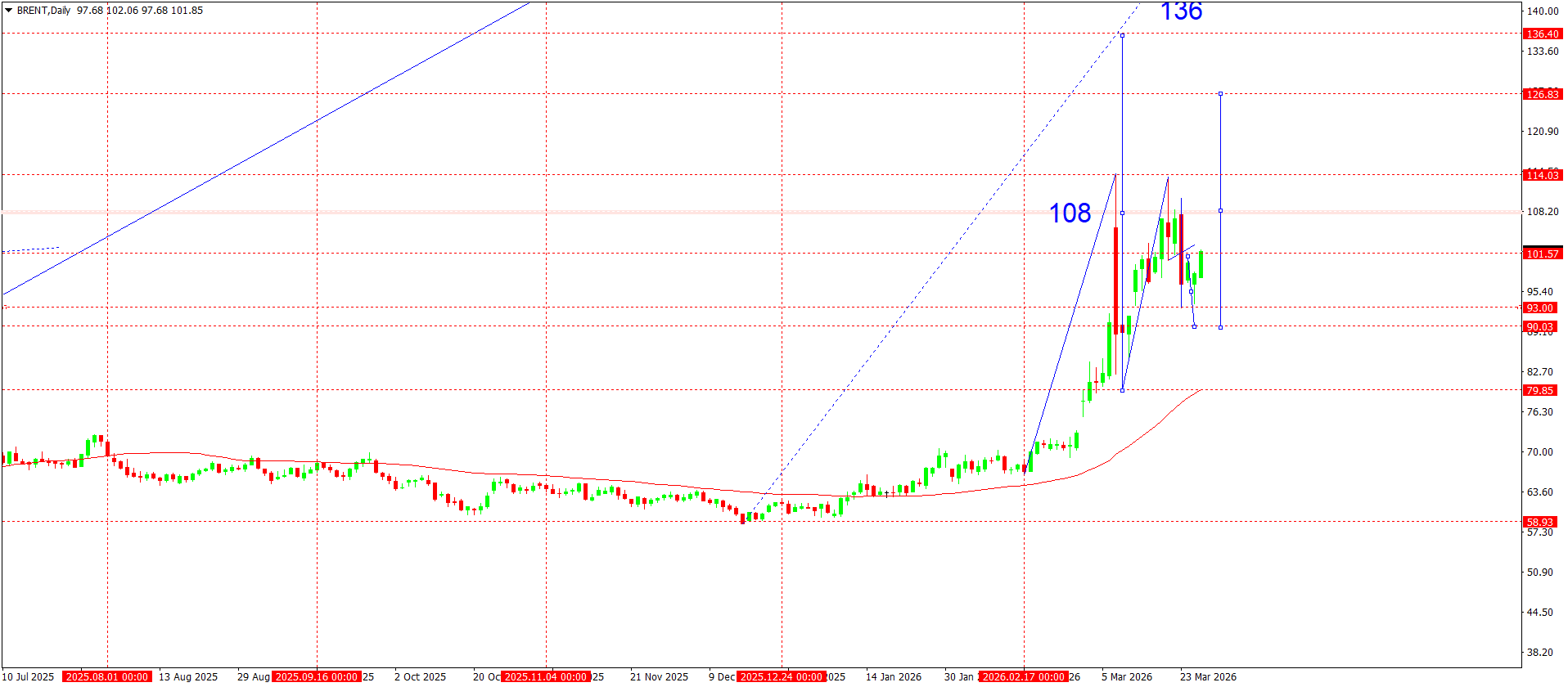 Күндік графикте Brent 58.93–70.00 диапазонындағы ұзақ консолидация кезеңі аяқталғаннан кейін қалыптасқан айқын өсуші құрылымды сақтап отыр. 79.85 аймағындағы негізгі қарсылықтан жоғары бұзылу жеделдетілген импульстік раллидің басталу нүктесі болды, ол кейін ұзартылған өсу толқынына ауысты.