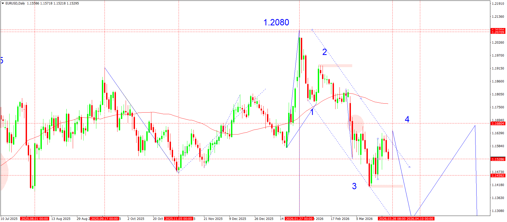 Күндік графикте EURUSD жұбы 1.2080 аймағында жергілікті максимум қалыптастырғаннан кейін төмендеу құрылымын сақтап отыр, бұл ағымдағы орта мерзімді циклдің негізгі шыңы ретінде әрекет етеді. Импульстік өсу толқыны аяқталғаннан кейін баға түзету фазасына өтіп, 2–3 құрылымы ретінде белгіленген төмендеуші арнаны қалыптастырды.
