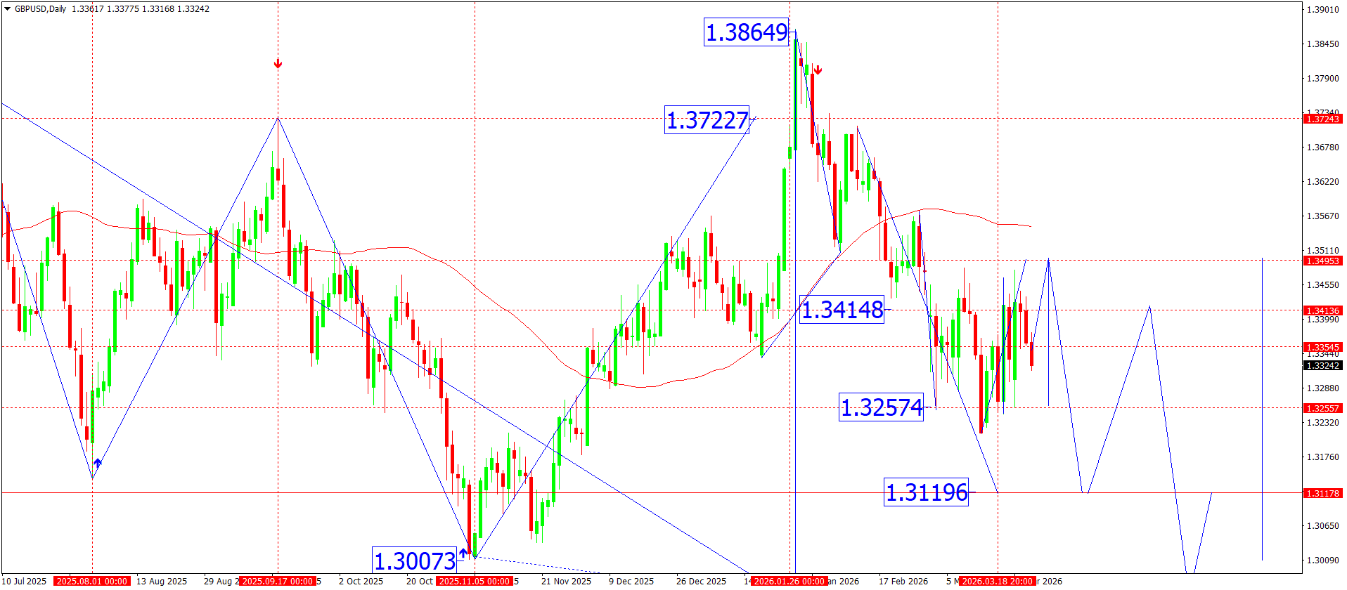 Техникалық тұрғыдан алғанда, күндік GBPUSD графигі 1.3864 маңындағы жергілікті максимумға жеткеннен кейін төмендеу құрылымының қалыптасып жатқанын көрсетуде. Төменге қарай күрт импульстен кейін баға түзету фазасына өтті, бірақ максимумдар мен минимумдардың құрылымы төмендеуді жалғастырып, тұрақты сату қысымын көрсетеді.