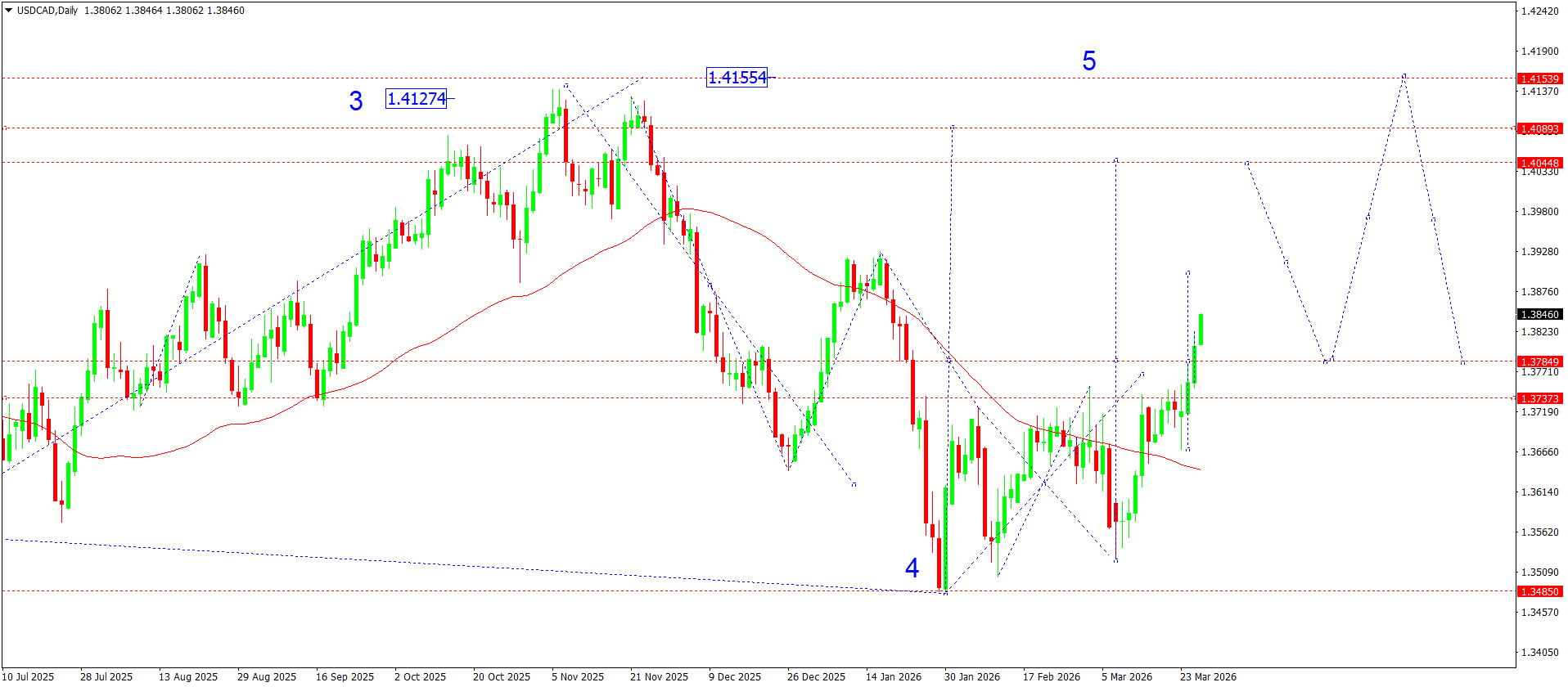 Одан кейінгі жоғары қозғалысты 5-толқынның басталуы ретінде түсіндіруге болады. Баға бұған дейін қарсылық болған және қазір қолдау ретінде қарастырылатын 1.3737–1.3784 аймағынан жоғары бекіді. Кері бұрылысқа қосымша растау ретінде жергілікті төмендеуші арнадан жоғары бұзылу және жоғарыға бұрыла бастаған жылжымалы орташа мәннен жоғары бекітілу қызмет етеді.