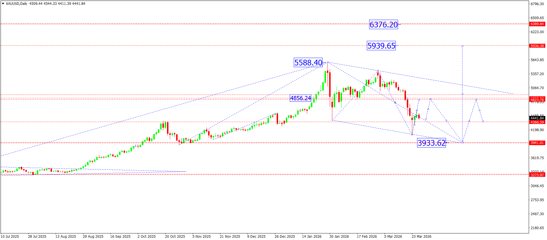 Күндік графикте XAUUSD орта мерзімді өсуші тренд құрылымын сақтап отыр, бірақ 5,588 маңындағы жергілікті максимумнан кейін түзету фазасы басталды. Төмендеу қозғалысы импульстік өсімнен кейінгі түзету толқынын меңзейтін төмендеуші арна ішінде дамып жатыр.
