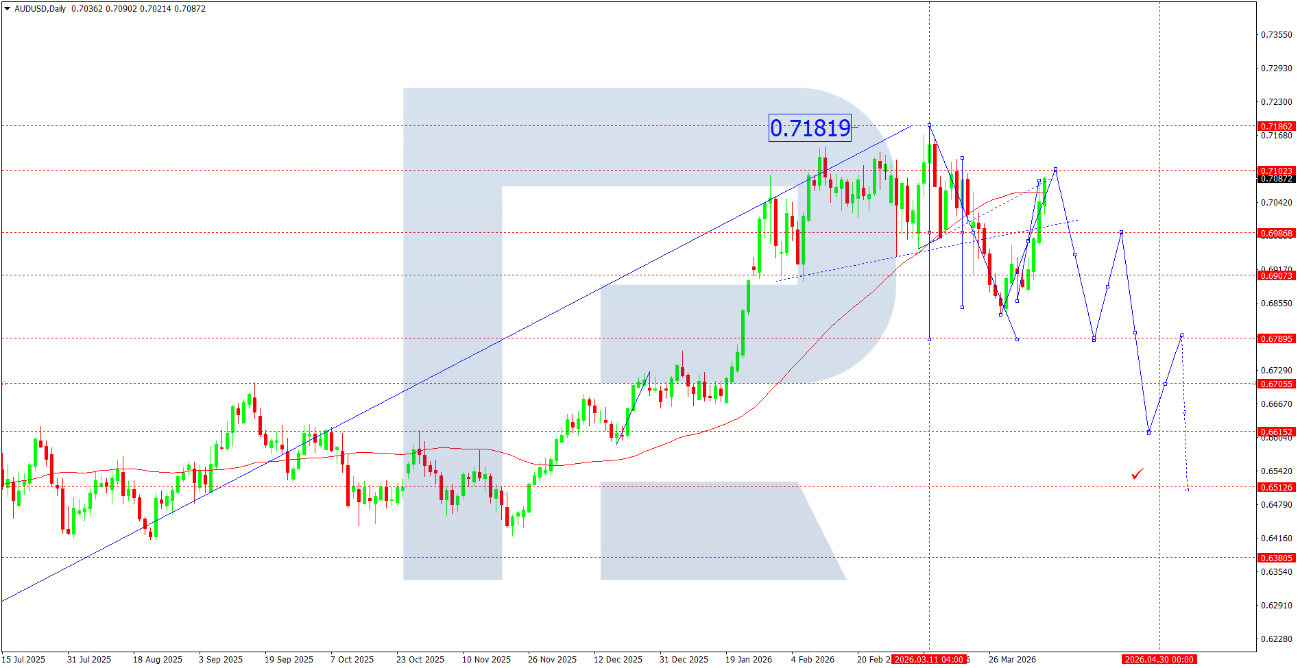 Толқындық тұрғыдан алғанда, құрылым өсу фазасының аяқталғанын және аралық түзетулермен бірге төмендеу импульсінің қалыптасқанын көрсетеді. 0.7102–0.7120 аймағы негізгі қарсылық ретінде әрекет етіп, баға осы жерден бірнеше рет төменге кері қайтты. Жылжымалы орташа мән де ағымдағы деңгейлер маңында орналасып, төмендеу қысымын күшейтуде.