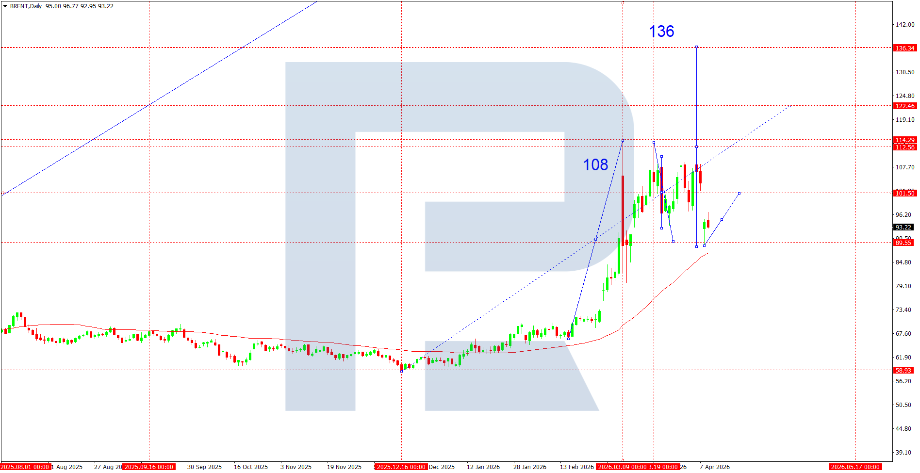 Күндік графикте Brent 70.00-нан төмен аймақтан 108.00 маңындағы шыңдарға дейін және одан әрі 136.00 экстремумына дейінгі күшті импульстен кейін өсуші құрылымды сақтап отыр, бұл негізгі орта мерзімді мақсат және бағдар нүктесі ретінде әрекет етеді. Шың қалыптасқаннан кейін нарық түзету мен консолидация фазасына өтті.