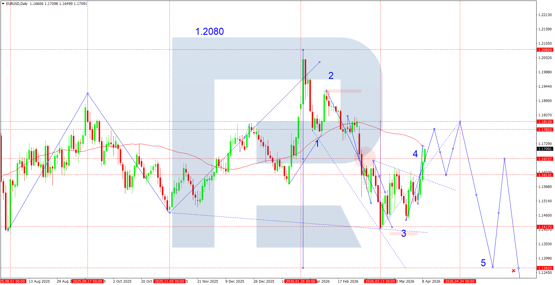 Күндік графикте EURUSD 1.2080 маңында шың қалыптастырғаннан кейін төмендеу құрылымын сақтап отыр. Ағымдағы құрылым төмендеу импульсі аяқталғаннан кейін түзетуші толқынның дамуын көрсетеді. 1.1900–1.1940 аймағы күшті қарсылық аймағы ретінде әрекет етіп, осы жерден төмендеу басталып, төменірек максимумдар тізбегін қалыптастырды.
