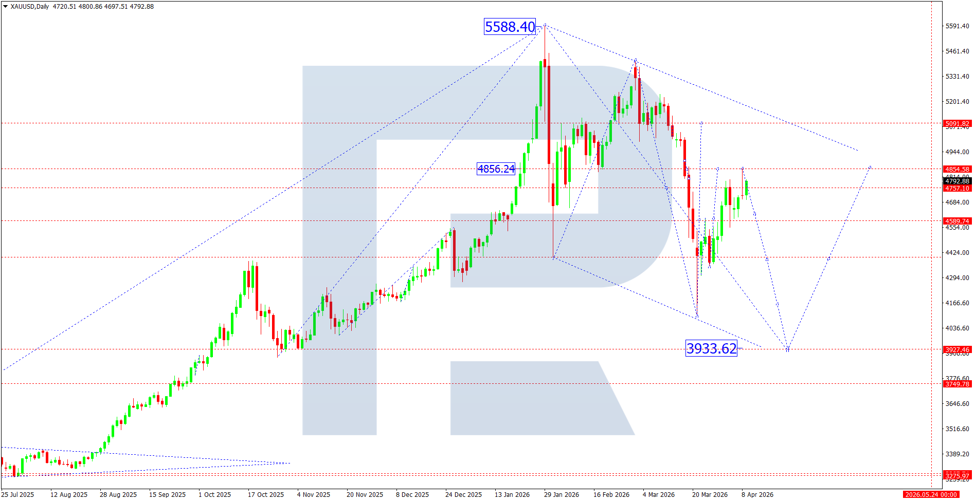Техникалық тұрғыдан алғанда, күндік график 5,588 маңындағы шыңнан кейін түзетуші төмендеу құрылымын көрсетеді. Баға төмендеу импульсін аяқтап, одан кейін 4,589–4,854 диапазонында дамып жатқан толқындық түзетуді қалыптастырды. 3,933-тен болған серпіліс жергілікті жоғары импульсті қалыптастырды, бірақ ол кеңірек төмендеу құрылымының ішіндегі түзету болып қалып отыр.