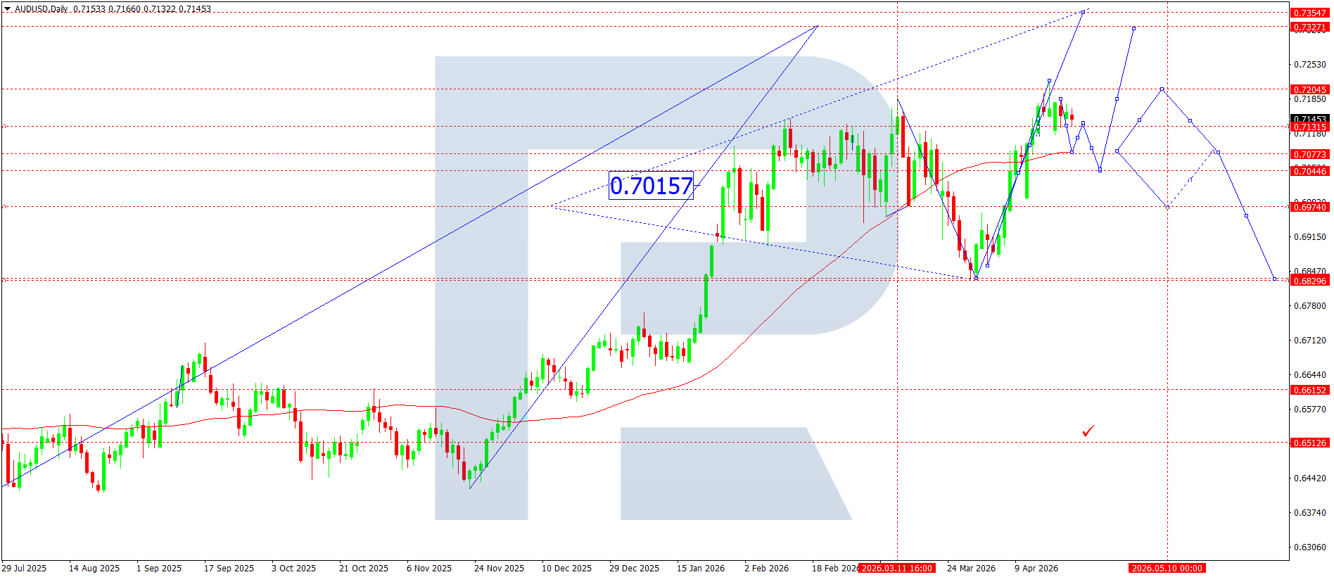 Толқындық құрылым ішінде импульстік фазаның аяқталуы және түзетуге өтуі мүмкін деп болжауға болады. Ағымдағы 0.7131–0.7204 аймағы күшті қарсылық кластері ретінде әрекет етеді. Егер нарық осы аймақтан жоғары бекіне алмаса, 0.7077, содан кейін 0.6974 бастапқы мақсаттарымен төмендеу түзетуінің қалыптасуы ықтимал. Балама сценарий баға 0.7204-тен жоғары бекітілсе, жаңа импульстің дамуын болжайды, бұл 0.7327, содан кейін 0.7354 бағытына жоғары әлеует ашады. Арна құрылымы ағымдағы деңгейлерге баға реакциясына байланысты өсімнің жалғасуы да, терең түзету де мүмкін екенін растайды.