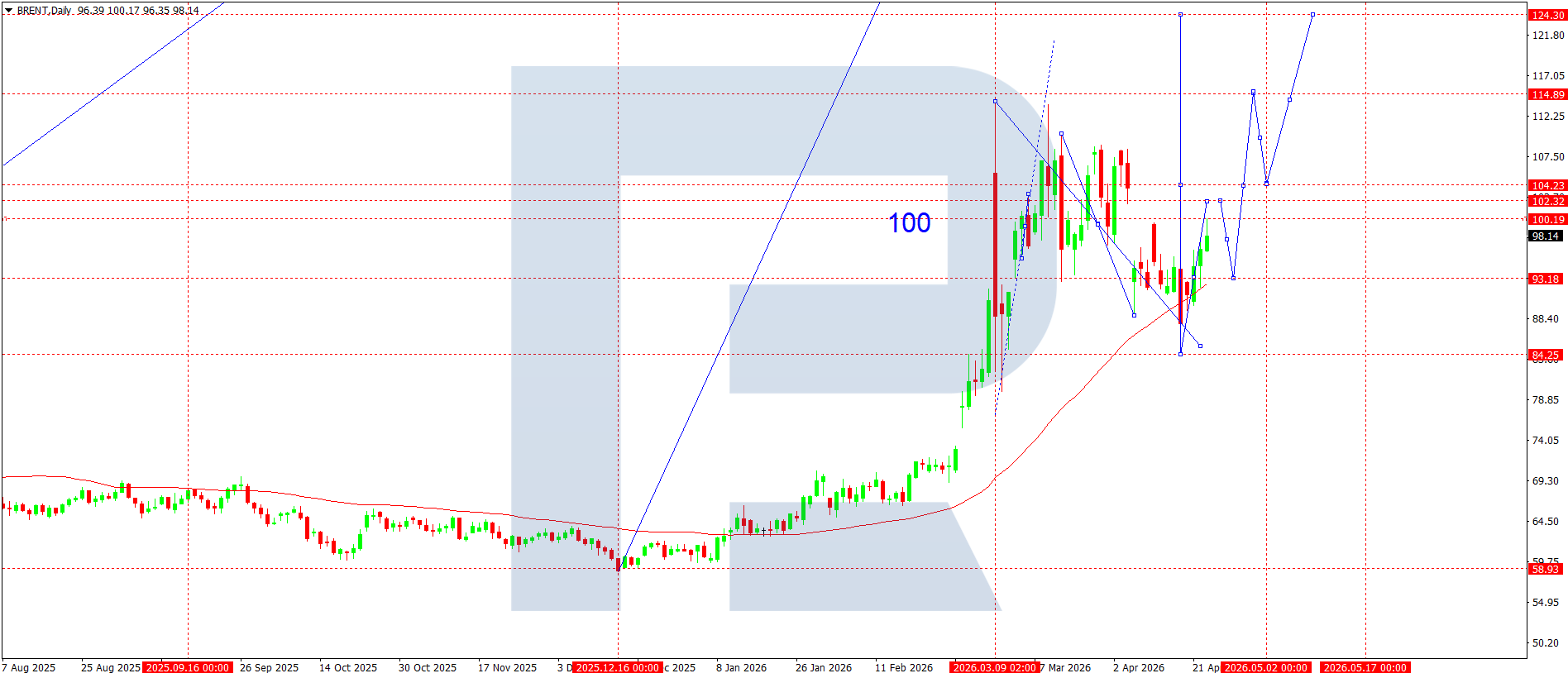 Күндік графикте Brent кері бұрылу базасы қалыптасқан 70.00–75.00 аймағынан болған импульстік өсімнен кейін өсуші құрылымды сақтап отыр. Баға 104.20–104.80 негізгі аймағына жетті, содан кейін түзету және консолидация фазасына өтті. Қазіргі уақытта 93.18 деңгейіндегі қолдауы бар жергілікті түзетуші үлгі қалыптасуда, ол аралық қолдау ретінде әрекет етеді.