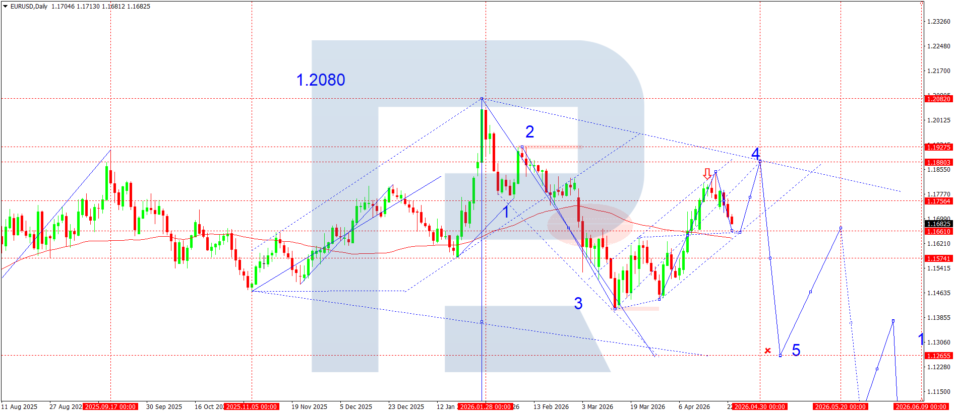 Күндік графикте құрылым көрсеткілермен белгіленген сценарийге толық сәйкес келеді. 1.2080 маңында шың қалыптастырғаннан кейін нарық төмендеу импульсі фазасына өтті, ол төмендеуші арна ішінде дамып жатыр. Ағымдағы құрылым 1.1756 маңында түзетуші толқынның аяқталуын көрсетеді, мұнда баға күшті қарсылық аймағына тап болды.