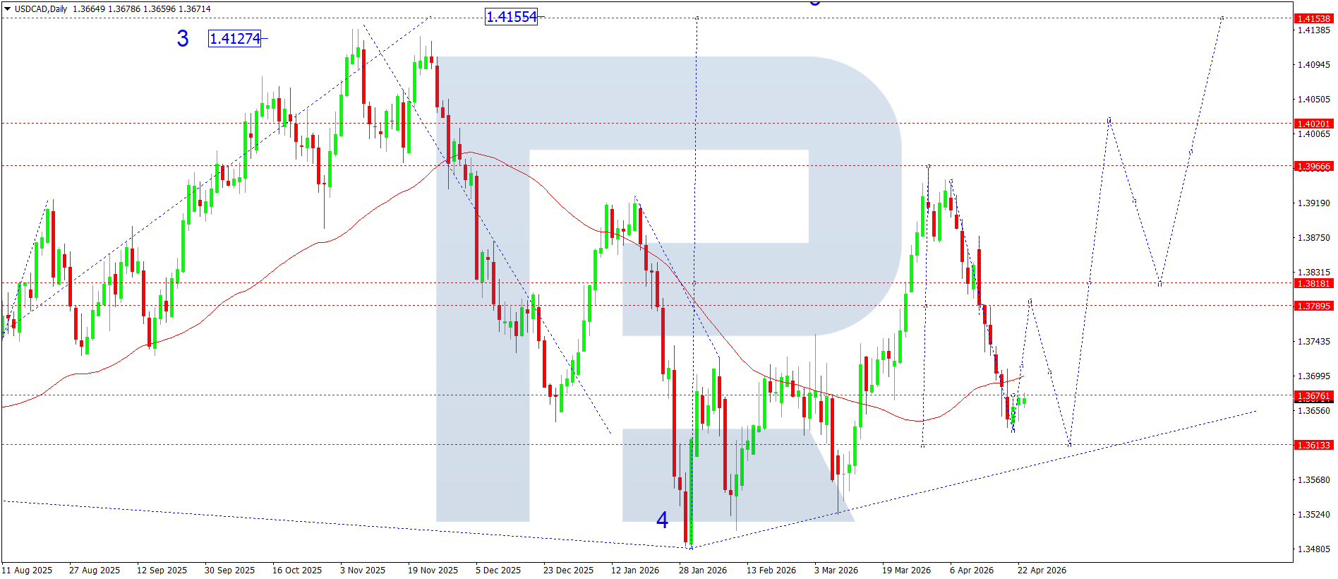 Күндік графикте 1.3869 маңында шың қалыптасқаннан кейін орта мерзімді төмендеу құрылымы сақталып отыр. Баға төмен қарай импульстік қозғалысты аяқтап, түзетуші қалпына келу фазасына өтті. Ағымдағы динамика төмендеу тренді ішіндегі жоғары түзетудің дамуын көрсетеді, мұнда баға 1.3598–1.3618 ұсыныс аймағын тестілеуде. Бұл аймақ бұрын бұзылған қолдаумен сәйкес келеді және қазір негізгі қарсылық ретінде әрекет етеді.