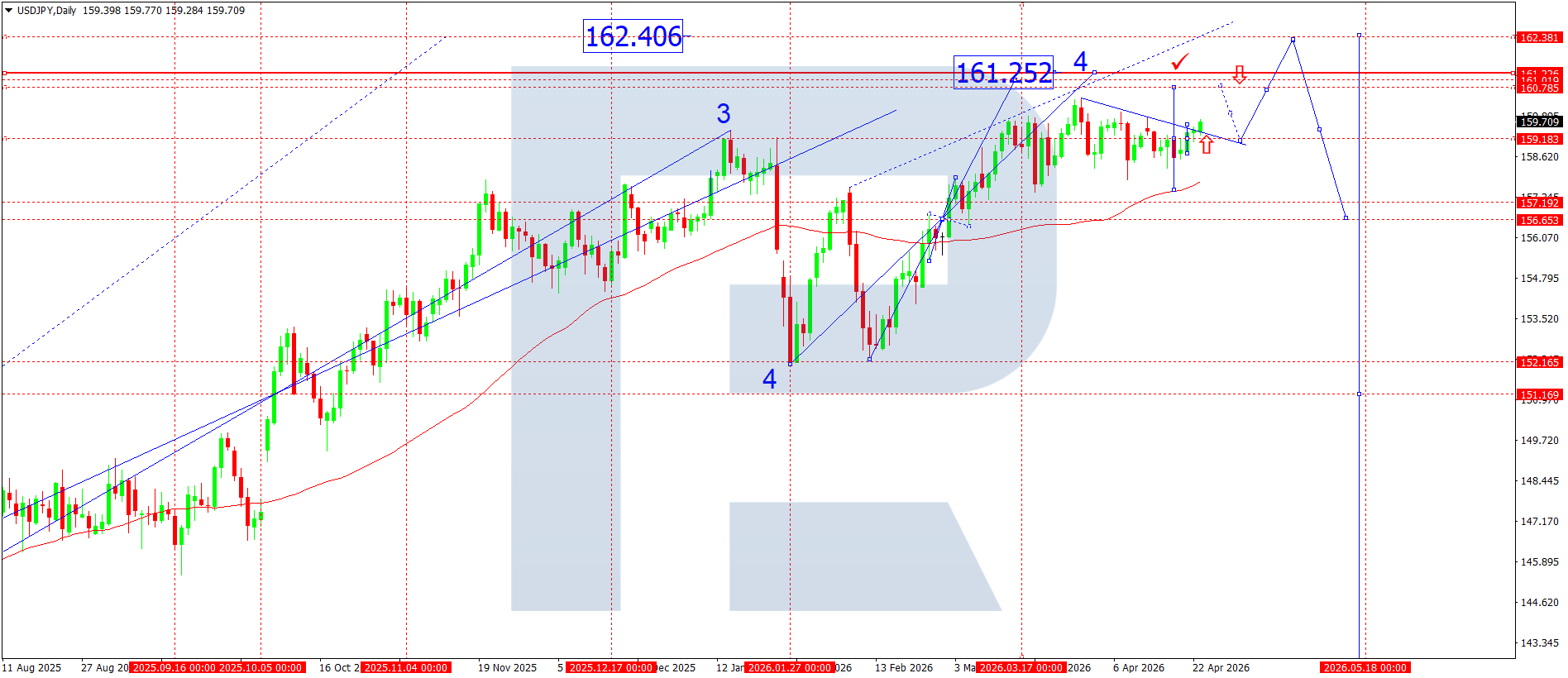Күндік графикте өсуші құрылым сақталып отыр, нақты анықталған импульстік толқын бар. 3-толқын 161.25 маңында аяқталды, содан кейін нарық түзету фазасына өтіп, 4-толқынды бүйірлік диапазон ретінде қалыптастырды. Ағымдағы динамика негізгі қарсылықтан төмен консолидацияны көрсетеді, ал баға өсуші тренд сызығы мен жылжымалы орташа мәннен жоғары қалып отыр, бұл орта мерзімді өсу трендінің сақталғанын растайды.