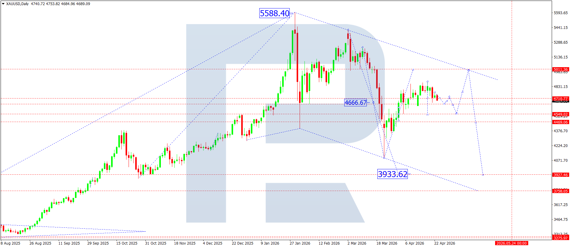 Күндік графикте XAUUSD 5,588.40 аймағында жергілікті максимум қалыптастырғаннан кейін төмендеуші түзетуші құрылымды сақтап отыр. Осы деңгейден баға төмендеуге өтті, содан кейін құбылмалы бүйірлік диапазон қалыптасты. Ағымдағы баға 4,710–4,750 негізгі қарсылық аймағынан төмен қалып отыр, бұл сатушылар қысымының сақталғанын көрсетеді.