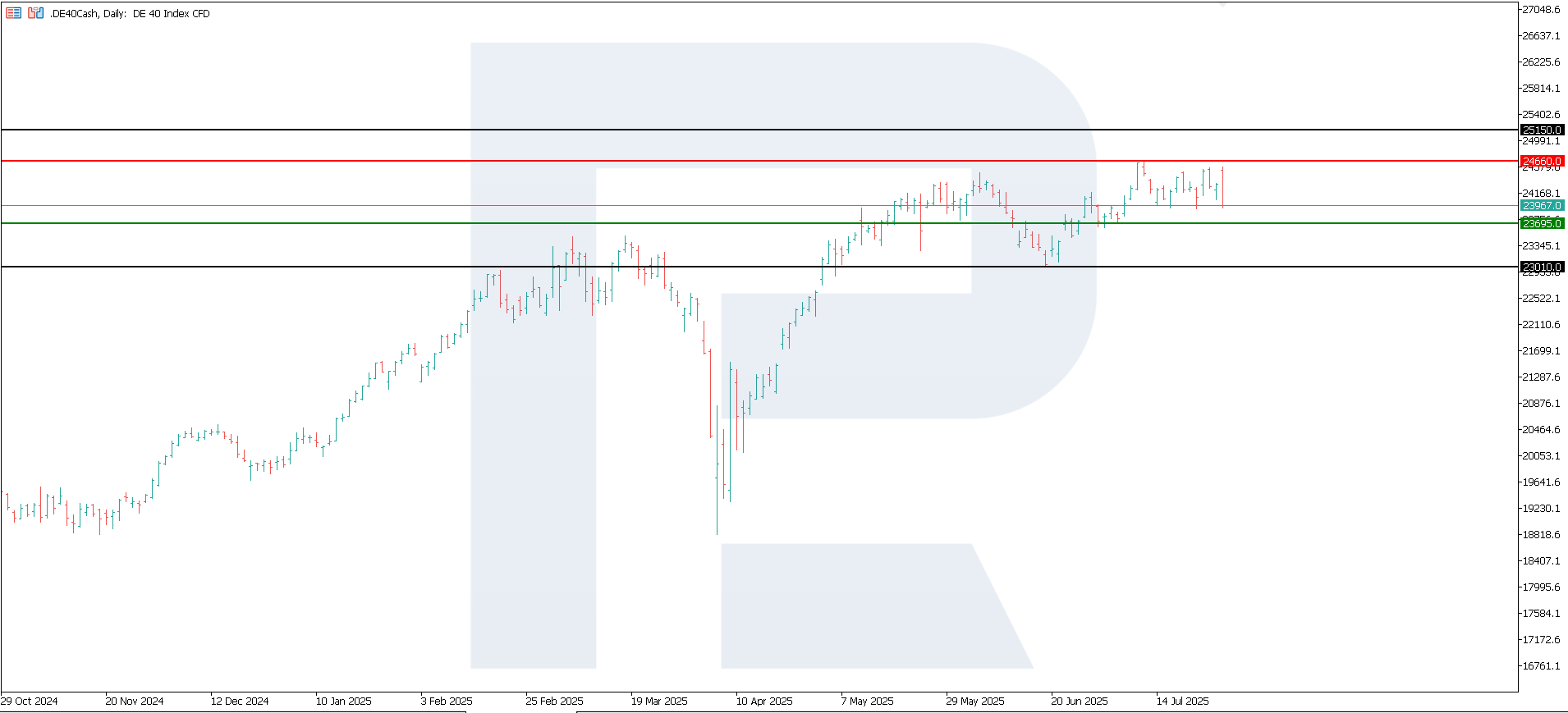 DE 40 қор индексі АҚШ пен ЕО арасындағы жаңа сауда келісімінен кейін күрт төмендеген түзету кезеңіне өтті. Бүгінгі DE 40 болжамы – теріс.