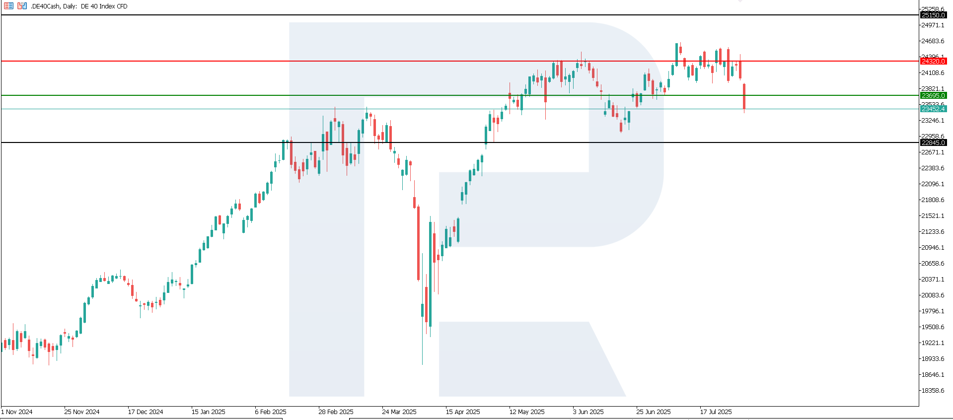 Германияның тоқсандық ЖІӨ көрсеткішінің 0.1%-ға төмендеуі экономикалық баяулауға нұсқайды (алдыңғы тоқсандағы 0.4% өсімнен кейін). Бұл бүкіл нарыққа қысым түсіруі мүмкін, өйткені инвесторлар экономикалық жағдайдың одан әрі нашарлауынан және компаниялардың қаржылық көрсеткіштерінің әлсіреуінен қауіптенуі ықтимал. Соның салдарынан олар тәуекел активтерін, соның ішінде акцияларды, қысқартуы мүмкін, бұл DE 40 индексіне қосымша қысым тудырады.