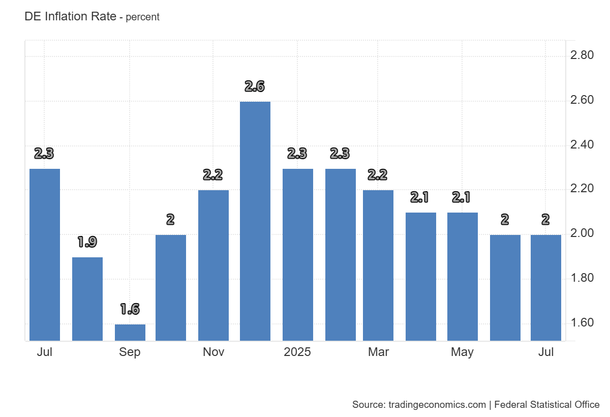 Германиядағы жылдық инфляция шілдеде 2.0%-ды құрап, болжамға сәйкес келді және өткен айдағы деңгейден өзгерген жоқ. Бұл нәтиже ЕОБ мақсатты деңгейіне жақын баға тұрақтылығын көрсетеді. Күтпеген өзгерістердің болмауы ақша-несие саясатына қатысты белгісіздікті азайтады: негізгі сценарий бойынша ағымдағы параметрлер сақталады, ал егер экономикалық баяулау тереңдесе және еуроаймақ бойынша деректер мүмкіндік берсе, кейіннен жұмсарту ықтималдығы қарастырылуы мүмкін.