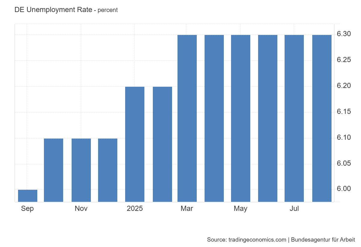 Германияның 2025 жылдың тамызындағы жұмыссыздық деңгейі 6.3% болып, болжамдармен және алдыңғы көрсеткішпен сәйкес келді. Бұл көрсеткіштің тұрақтылығы ішкі және сыртқы экономикалық қиындықтарға қарамастан, Германия еңбек нарығының орнықты екенін растайды. Германия қор нарығы үшін мұндай тұрақтылық өте маңызды. Тұрақты жұмыссыздық деңгейі үй шаруашылықтарының сұранысының сақталуын білдіреді, бұл ішкі тұтынуды қолдайды.