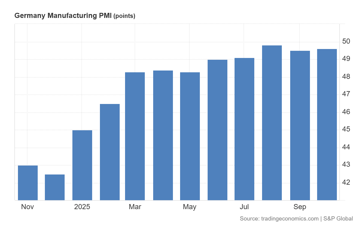 Германияның қазан айындағы өндірістік PMI көрсеткіші 49.6 пунктті құрады, бұл консенсус-болжам (49.5) мен алдыңғы мәннен (49.5) сәл жоғары. Көрсеткіш өнеркәсіп секторының әлі де қысқару аймағында екенін білдірсе де, бейтарап шекке жақындаған тұрақтану белгілерін көрсетеді. Қор нарығы үшін бұл көрсеткіш қалыпты оң сигнал болып табылады: өндірістегі төмендеу қарқынының баяулауы циклдік секторлардың болашақ ақшалай ағымдарын оң бағалауға мүмкіндік береді, қуаттың толық пайдаланылмауынан болатын маржа қысымының төмендеуіне ықпал етеді және өнеркәсіптік активтер бойынша дисконттарды қысқартуға көмектесуі мүмкін. Алайда, индекс 50-ден төмен болғандықтан, ол ішкі және сыртқы сұраныстың әлсіздігін көрсетуді жалғастыруда. Сондықтан, өсу әлеуеті шектеулі болып қалады және келесі деректердің жақсаруы арқылы расталуға тәуелді.