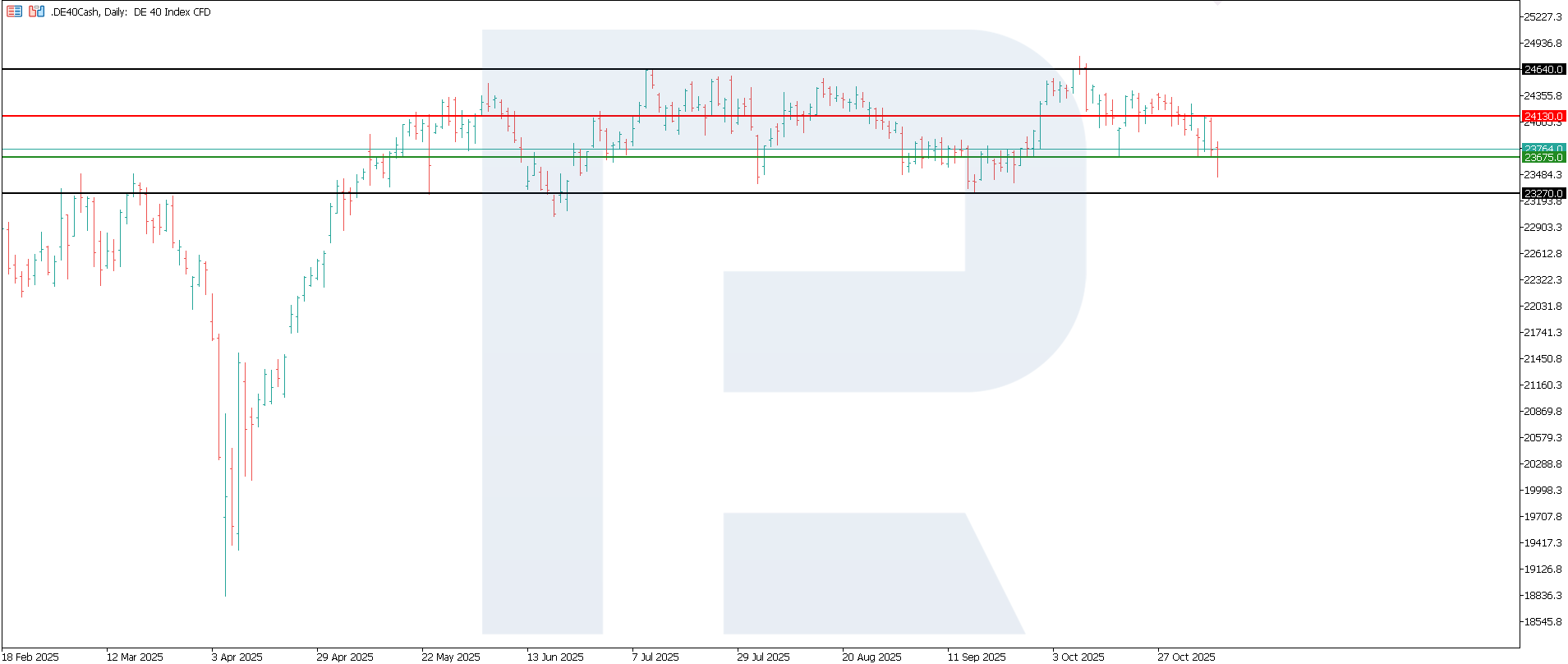 Сыртқы сектордағы әлсіздік белгілері Еуропалық орталық банктің жұмсақ саясат ұстанымын қолдайды, бұл облигациялар кірістілігінің өсуін шектеп, жылжымайтын мүлік, инфрақұрылым және тұтынушылық сектордың кейбір бөліктеріне қолдау көрсетеді. Жалпы алғанда, сауда балансы есебінің Германия қор нарығы мен DE 40 индексіне әсері экспортқа бағытталған және циклдік компаниялар үшін қалыпты теріс, ал жұмсақ қаржы жағдайлары мен әлсіреуі мүмкін еуродан пайда көретін секторлар үшін бейтарап немесе сәл қолайлы болып табылады. Индекс үшін ең жақын төмендеу мақсаты – 23,270.0 деңгейі.