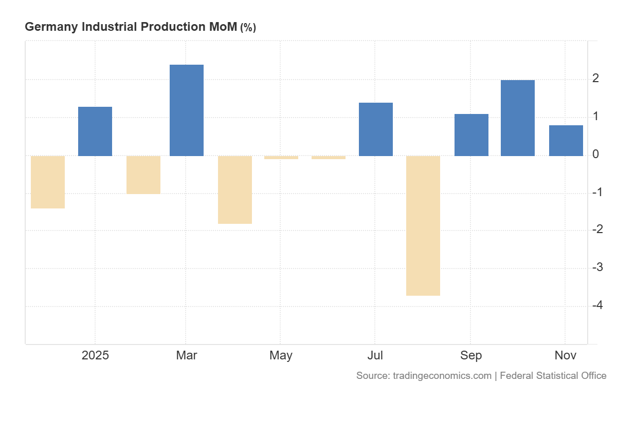 Германияның өнеркәсіптік өндіріс көрсеткіші айлық есепте 0.8% болды, бұл 0.6%-дық төмендеу жөніндегі күтулерден айтарлықтай жоғары. Акциялар нарығы үшін бұл айқын оң тосынсый болып табылады, ол алдағы айларда экономиканың күрт баяулау қаупін азайтып, циклдік секторларға сезімтал компаниялардың табысы мен маржаларына қатысты қысқа мерзімді күтулерді жақсартады. Мұндай деректер әдетте тәуекелге деген тәбетті арттырып, өнеркәсіптік және экспортқа бағытталған акцияларды сатып алуға инвесторлардың ынтасын күшейтеді.