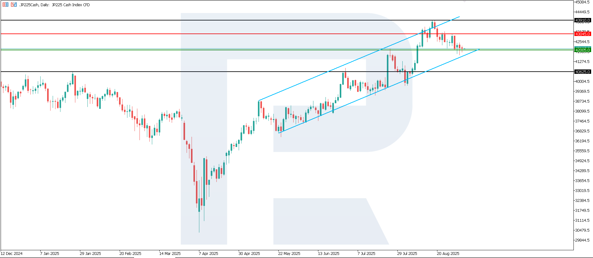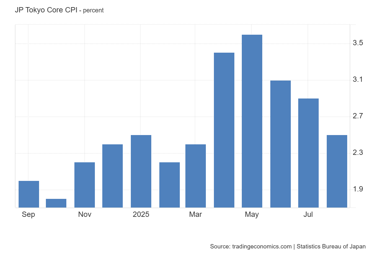 Токионың тұтыну бағалары индексі (ТБИ) 2025 жылдың тамызында жылдық есепте 2.5%-ға өсті, бұл болжамдарға сәйкес келді, бірақ алдыңғы 2.9%-дан төмен болды. Жапон қор нарығы үшін бұл маңызды нәтиже. Инфляцияның баяулауы тұтынушылар мен бизнеске қысымды азайтып, ішкі сұраныс үшін оң фактор болуы мүмкін. Алайда инфляция Жапония банкінің (шамамен 2.0%) нысанынан жоғары болып қала береді, бұл ақша-несие саясатын сақтықпен қайта қарау қажеттігін қолдайды.