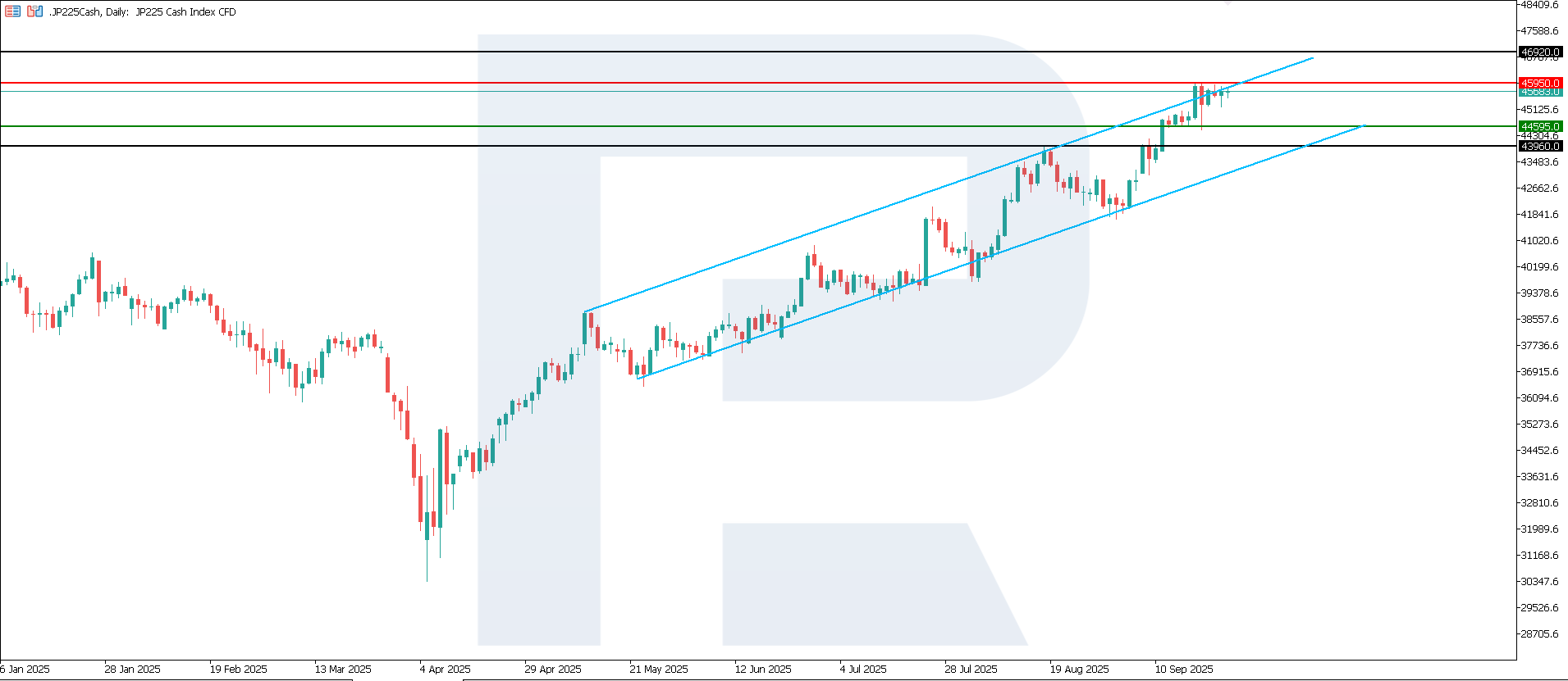 Жапонияның пайыздық мөлшерлемесі: https://tradingeconomics.com/japan/interest-rateJP 225 индексі өсуін қайта жалғастырып, жаңа тарихи максимумға жетті. Қолдау деңгейі 44,595.0, ал қарсылық 45,950.0 деңгейінде орналасқан. Қазіргі уақытта өсуші трендтің жалғасу ықтималдығы жоғары.