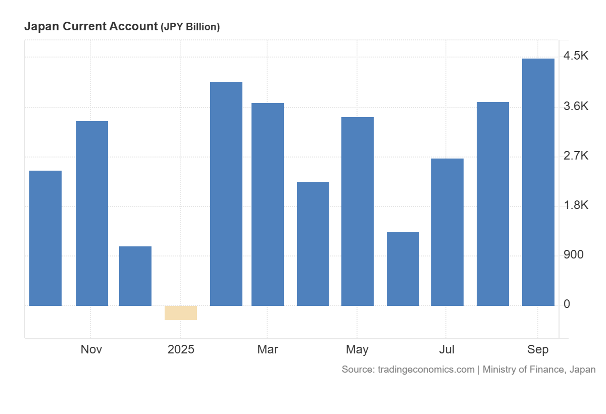 Жапонияның ағымдағы операциялар шоты 4.483 триллион иен профицит көрсетті, бұл болжанған 2.468 триллион және алдыңғы 3.701 триллион көрсеткіштерден әлдеқайда жоғары. Бұл шетелден түсетін кіріс ағыны — экспорт пен импорт айырмасы және шетелдік инвестициялардан түскен табыс — күткеннен мықтырақ болғанын білдіреді. Бұл экономика үшін оң белгі: сыртқы теңгерім тұрақты қалыпта, ал ел көбірек шетел валютасы мен инвестициялық табыс табуда.