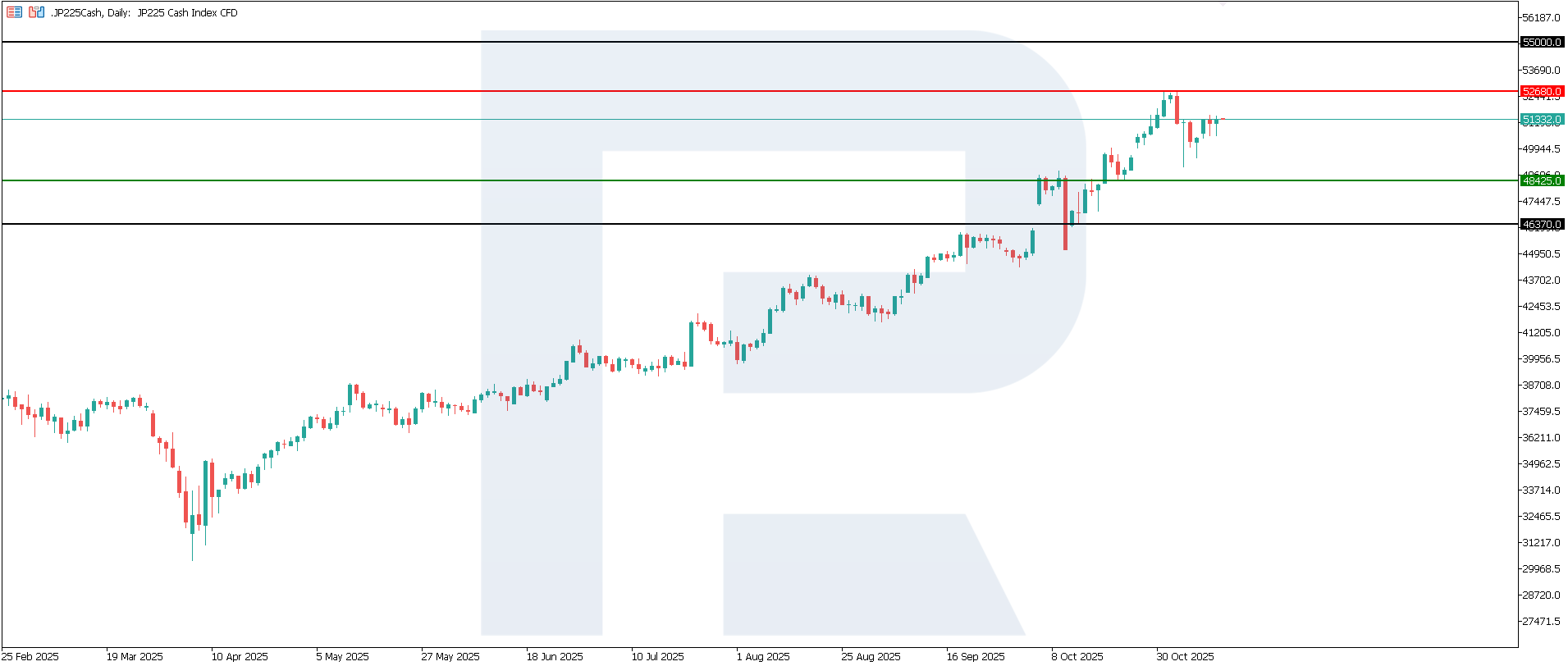 Экспортқа бағытталған компаниялар үлесі жоғары JP 225 индексі үшін бастапқы реакция қалыпты оң сипатта. Индекс ішінде айналымдық ауысу ықтимал: автокөлік пен электроника өндірушілер әлсіз нәтиже көрсетуі мүмкін, ал импорттың арзандауынан және тұрақты қаржы жағдайларынан пайда көретін ішкі нарыққа бағытталған компаниялар беріктік танытуы ықтимал. Болашақ қозғалыстың ауқымы ағымдағы шот профицитінің құрамын нарық қалай түсіндіретініне байланысты болады. JP 225 индексінің келесі өсу мақсаты — 55,000.0 деңгейі.