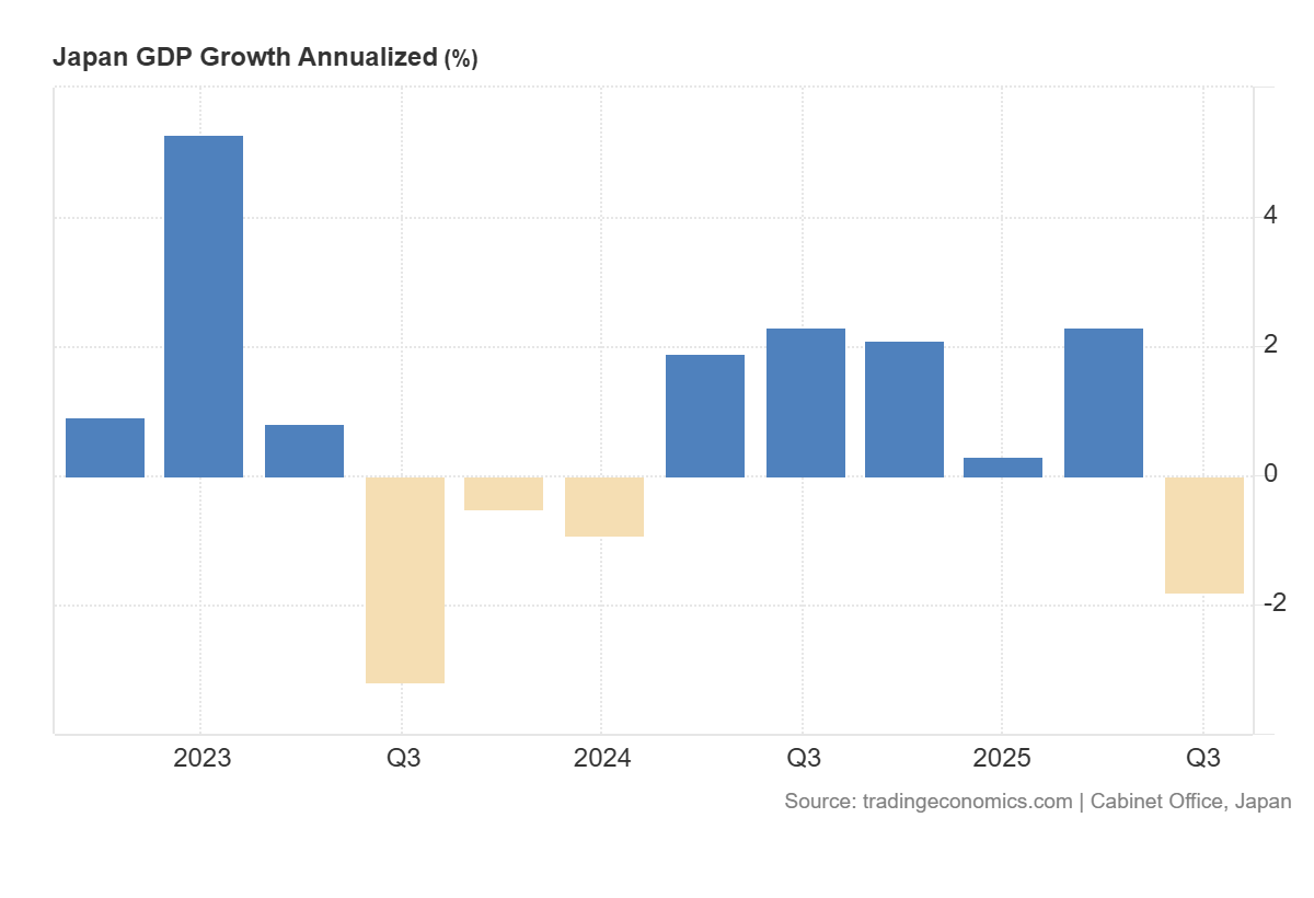 Жапонияның жылдық қарқынмен есептелген ЖІӨ көрсеткіші -2.5% болжамына және алдыңғы 2.3% өсімге қарсы -1.8% төмендеуді көрсетті. Бұл экономиканың өсуден қысқаруға ауысқанын білдіреді, дегенмен төмендеу сарапшылар күткеннен әлсіз болды. Формалды түрде бұл экономиканың салқындауын білдіреді: компаниялар орта есеппен өткен жылмен салыстырғанда азырақ өндіреді және сатады, ішкі де, сыртқы да сұраныс әлсіреген. Мұндай деректер жапон қор нарығы үшін әдетте теріс болып саналады, себебі әлсіз экономика тұтынушылар мен бизнес тарапынан сақтықты арттырады, инвестицияның баяулауына және компания кірістеріне қысымға әкеледі, әсіресе ішкі нарыққа бағытталған компаниялар үшін.