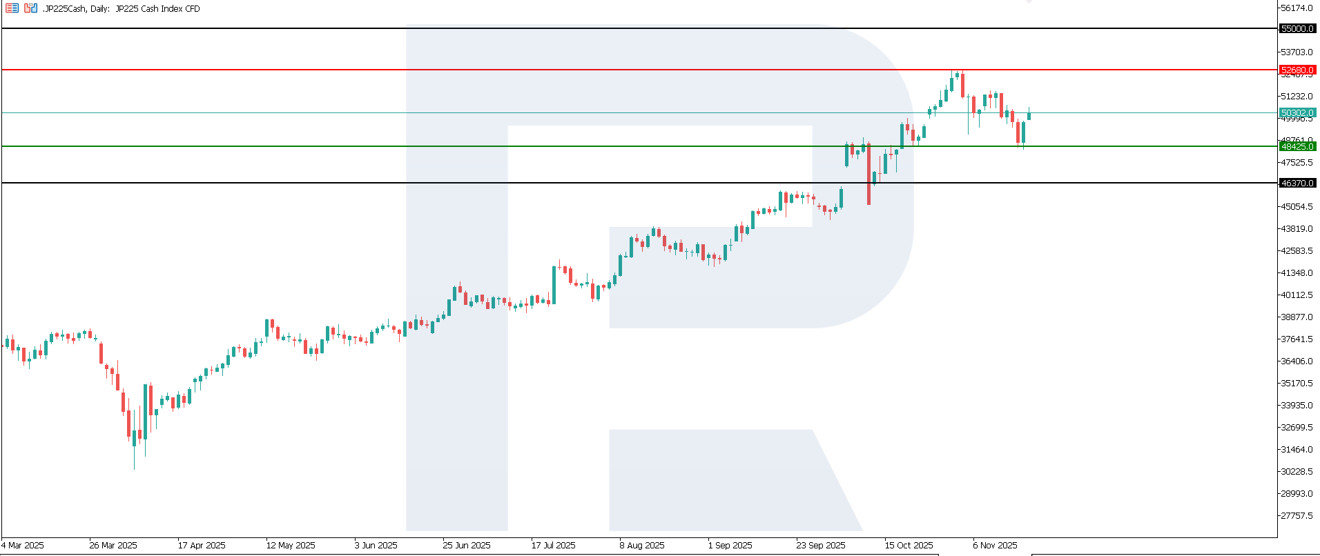 Жапонияның жылдық ЖІӨ өсімі: https://tradingeconomics.com/japan/gdp-growth-annualizedТүзету фазасы аясында JP 225 48,425.0 қолдау деңгейінен серпілді. Өсу жалғаспас бұрын индекс біраз уақыт бүйірлік арнада саудалануы мүмкін. Жаһандық тренд жоғары бағытта қалып отыр. Қарсылық 52,680.0 деңгейінде қалыптасты. Ең жақын жоғары мақсат – 55,000.0.