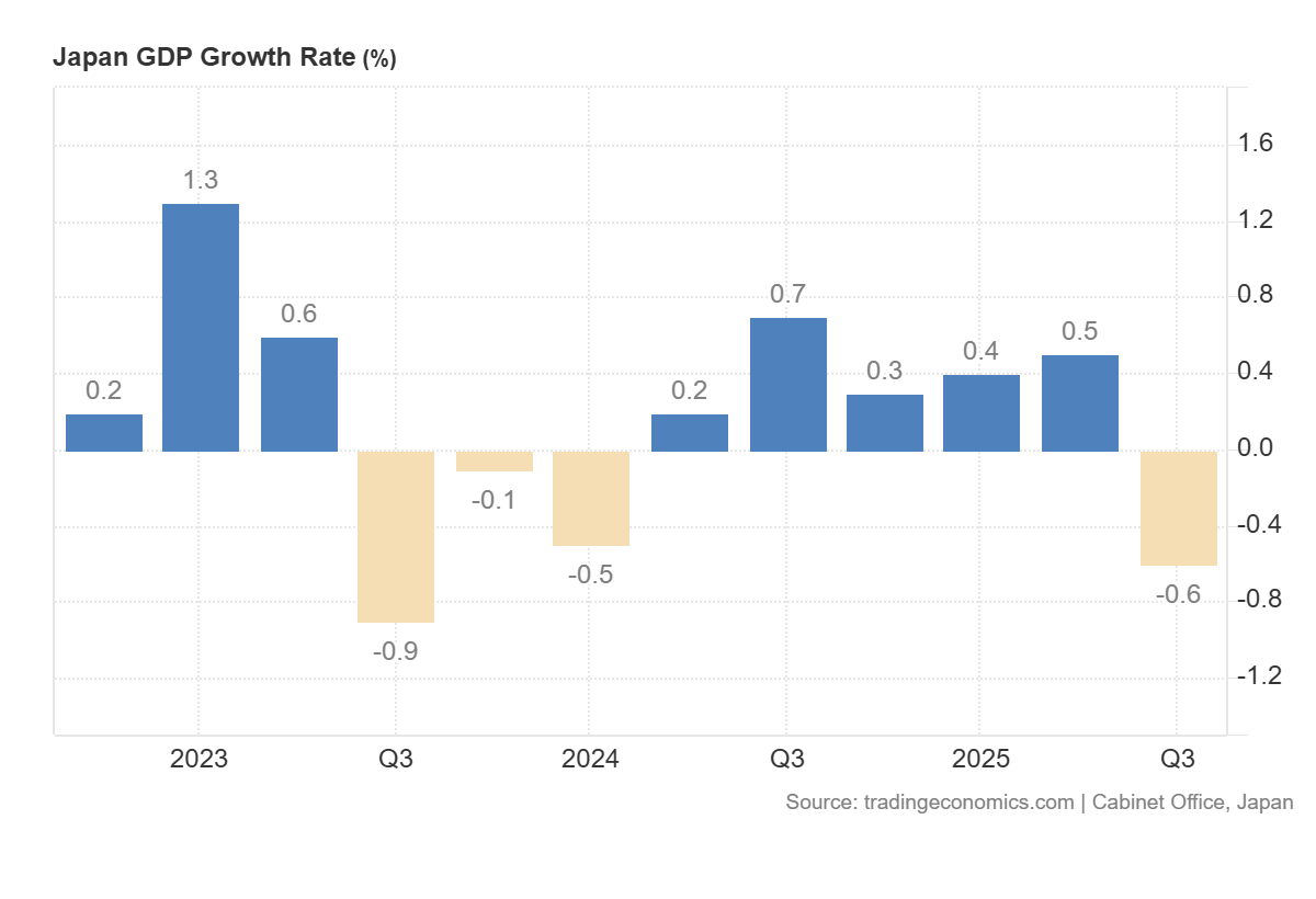 Жапонияның ЖІӨ-сі тоқсандық есепте -0.6% төмендеп, болжамнан әлсіз және алдыңғы өсімнен айтарлықтай төмен болды. Бұл экономикалық белсенділіктің айқын баяулағанын көрсетеді: тұтынушылық шығындар, инвестициялар және экспорт әлсіреді. Мұндай жағдай инвесторлардың экономикалық қалпына келу қарқыны мен корпоративтік табыстардың тұрақтылығы туралы алаңдаушылығын арттырады. Жапонияның акциялар нарығы үшін мұндай көрсеткіштер шектеуші фактор болып табылады. Әдетте нарық қатысушылары әлсіз ЖІӨ деректерін компаниялар үшін тәуекелдердің жоғарылауының белгісі ретінде қабылдайды.