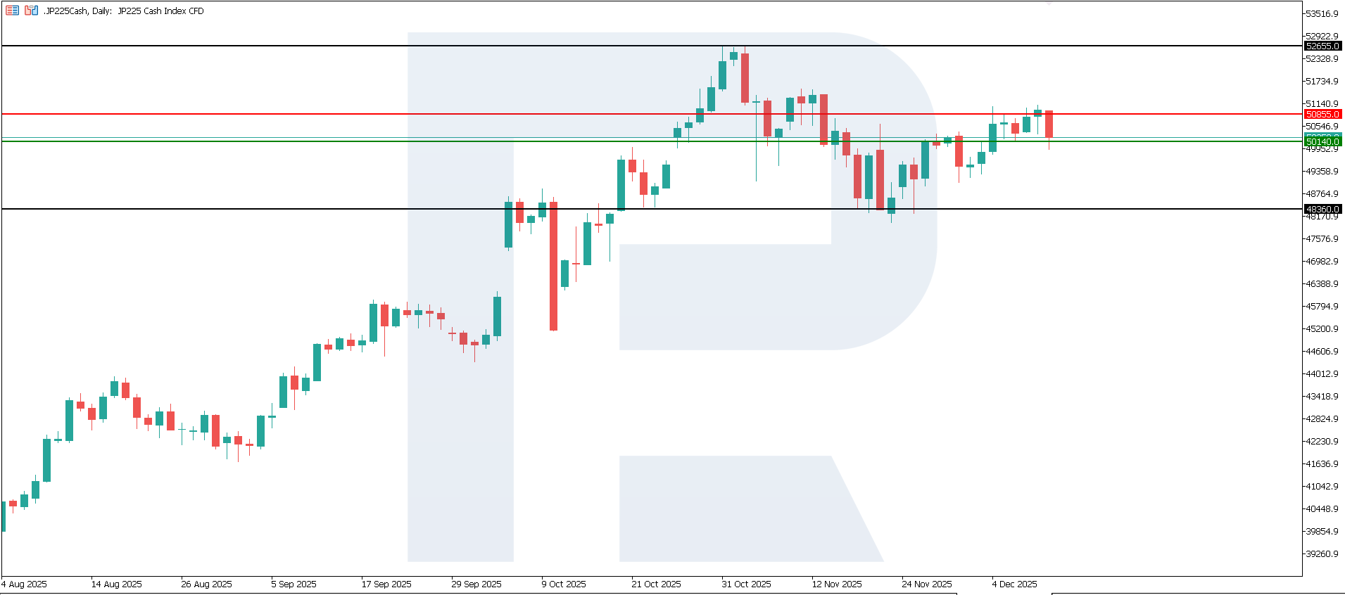 Жапонияның ЖІӨ өсу қарқыны: https://tradingeconomics.com/japan/gdp-growthJP 225 өсуші трендте саудалануды жалғастыруда. Қолдау аймағы 50,140.0 деңгейінде, ал ең жақын қарсыласу 50,855.0 маңында орналасқан. Осы деңгейлер арасындағы диапазонның тарылуы негізгі нарық қатысушылары тарапынан актив жинақталуын меңзейді. Келесі өсім мақсаты — 52,655.0 деңгейі.