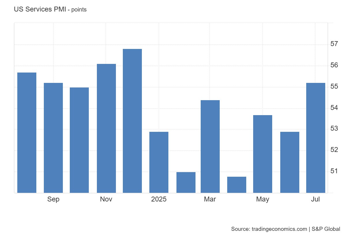 АҚШ-тың шілде айындағы қызмет көрсету секторындағы PMI алдын ала көрсеткіші 55.2 деңгейінде тіркеліп, 53.0 болжамынан және алдыңғы 52.9 мәнінен асып түсті. Бұл АҚШ экономикасының негізгі секторы – қызмет көрсету саласында қарқынды өсім бар екенін көрсетеді және бизнес белсенділігінің артуын білдіреді. Қаржыдан бастап көлік пен қонақүй бизнесіне дейінгі қызмет салаларында сұраныстың артқаны байқалады.