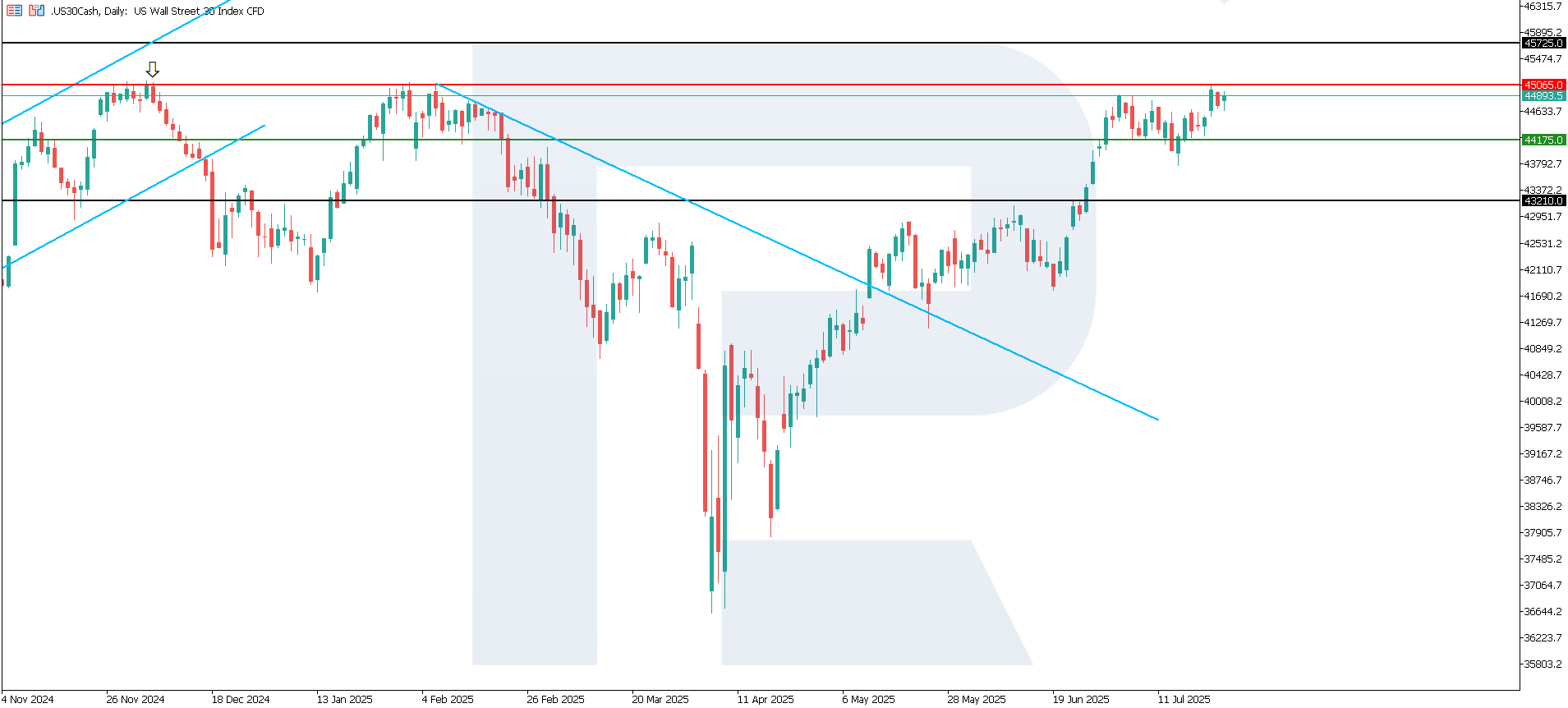 US 30 индексі тағы да бағытын өзгертіп, өсу траекториясына көшті. Қарсылық деңгейі 45,065.0 белгісінде, ал қолдау деңгейі 44,175.0 шамасында қалыптасқан. Құбылмалылық жоғары деңгейде сақталып тұр, және қысқа мерзімді нақты тренд әлі де қалыптаспаған. Дегенмен, жаңа тарихи максимумға шығу ықтималдығы сақталуда.