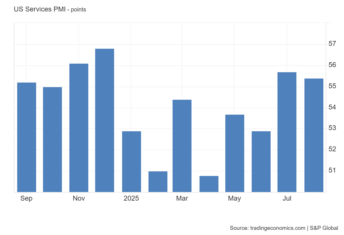 Жарияланған 2025 жылғы шілде айының қызмет көрсету PMI индексі 55.4 пунктті құрады, болжамдағы 54.2-ден жоғары, бірақ алдыңғы 55.7-ден сәл төмен. Бұл көрсеткіш қызмет көрсету секторының тұрақты өсуін жалғастырып жатқанын білдіреді, сондай-ақ кеңею мен құлдырауды айыратын негізгі 50 пункттік шектен әлдеқайда жоғары. Қызмет көрсету секторы АҚШ ЖІӨ-нің екіден үш бөлігінен астамын құрайтындықтан, оның тұрақты көрсеткіштері экономиканың жалпы оң серпінін айғақтайды.
