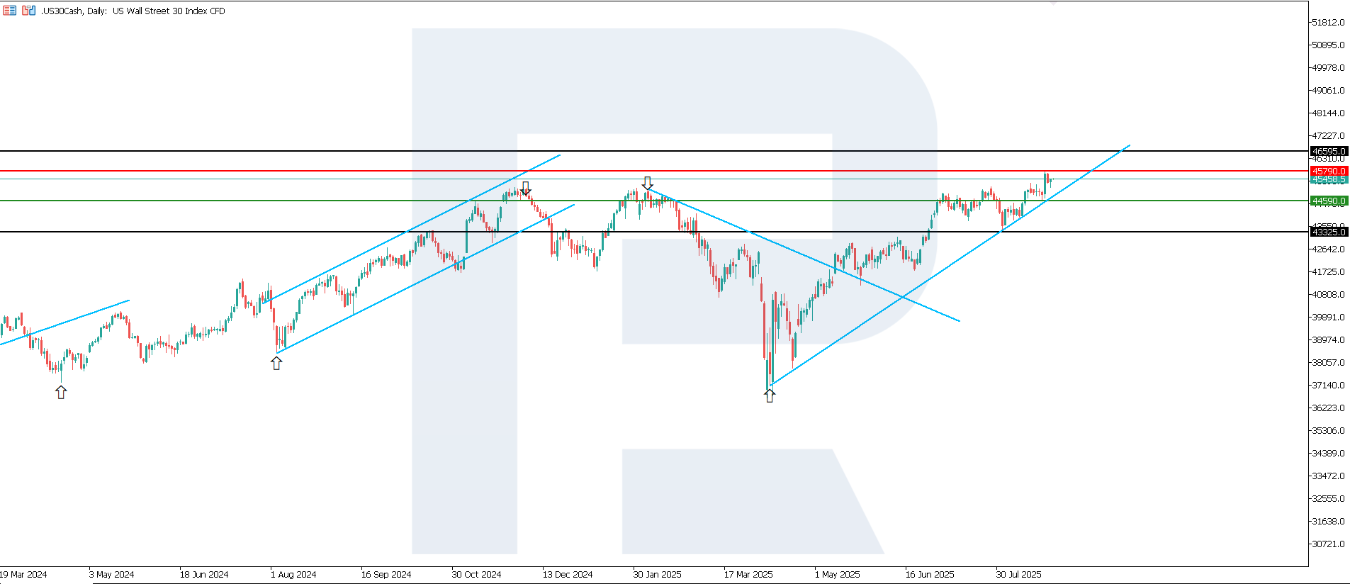 PMI деректері қысқа мерзімде нарық үшін және жалпы US 30 үшін оң қабылдануда, бірақ инвесторлар ФРЖ-ның саясаттық бағыты мен инфляция динамикасына реакциясына мұқият қарайды. Қаржы секторы тұрақты экономикалық белсенділіктен пайда көреді, ол несиелеу мен инвестициялық процестерді қолдайды. Технологиялық және коммуникациялық компаниялар да жанама түрде ұтады, өйткені қызметтер өсуі цифрлық шешімдер мен онлайн-платформаларға сұранысты арттырады. Индекстің келесі өсу мақсаты 46,595.0 болуы мүмкін.