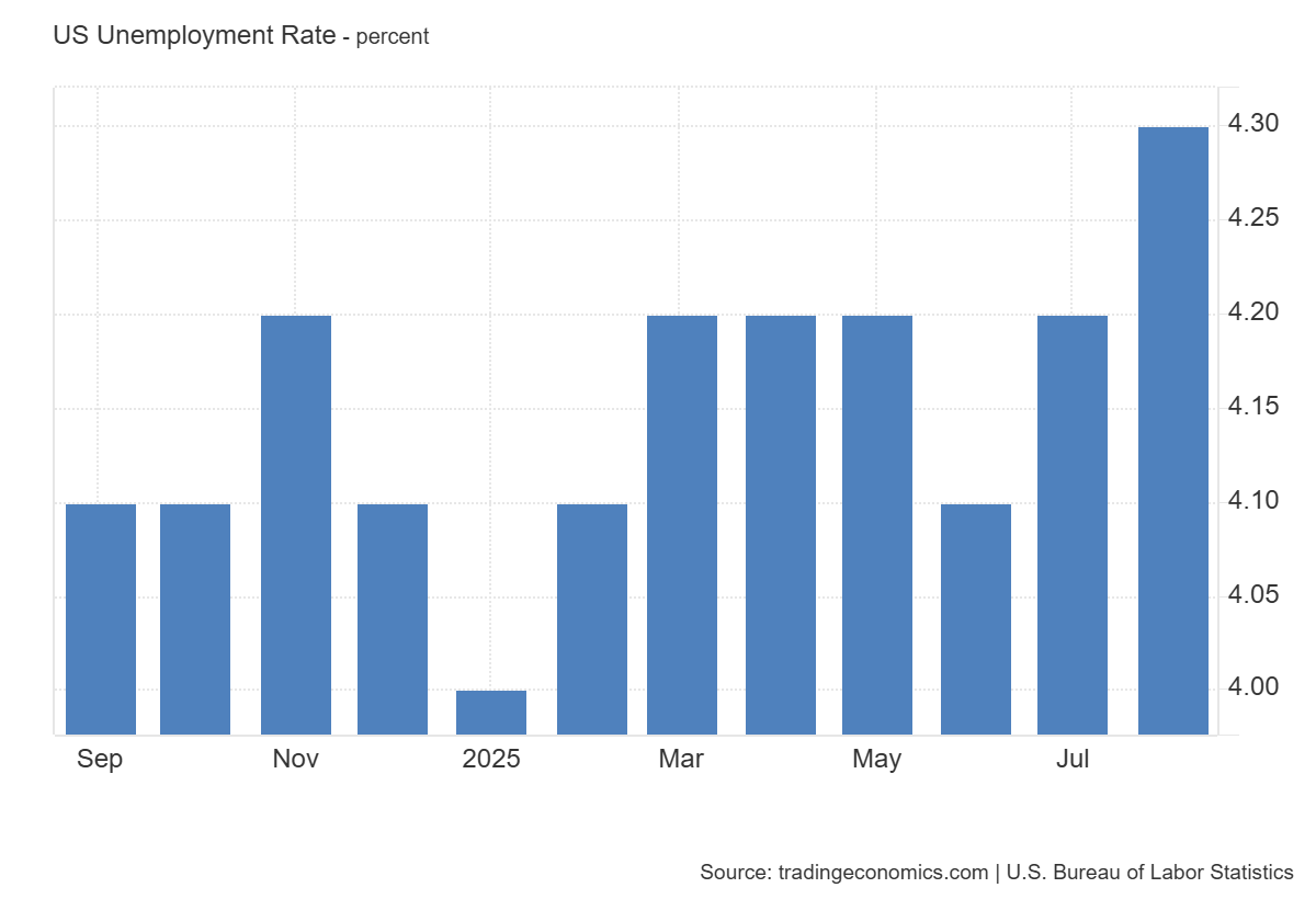 АҚШ-тағы жұмыссыздық деңгейі 4.3% болып, нарық болжамына сәйкес келді, бірақ шілдедегі 4.2%-дан жоғары болды. Макроэкономикалық тұрғыдан бұл еңбек нарығының біртіндеп салқындағанын көрсетеді: жұмыссыздықтың шамалы өсуі жалақыға қысымды азайтып, қызмет көрсету секторындағы инфляцияны төмендетеді. Қаржылық жағдай тұрғысынан бұл жалпы алғанда қолайлы, өйткені ақша-несие саясатының жұмсаруы жөніндегі күтулер артады, қазынашылық кірістілігі төмендеуге бейім, ал компаниялардың қаржыландыру құны азаяды. Сонымен қатар, жұмыссыздықтың өсуі экономикалық өсім қарқынының баяу екенін білдіреді.